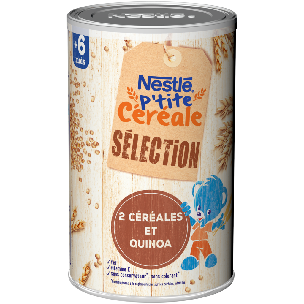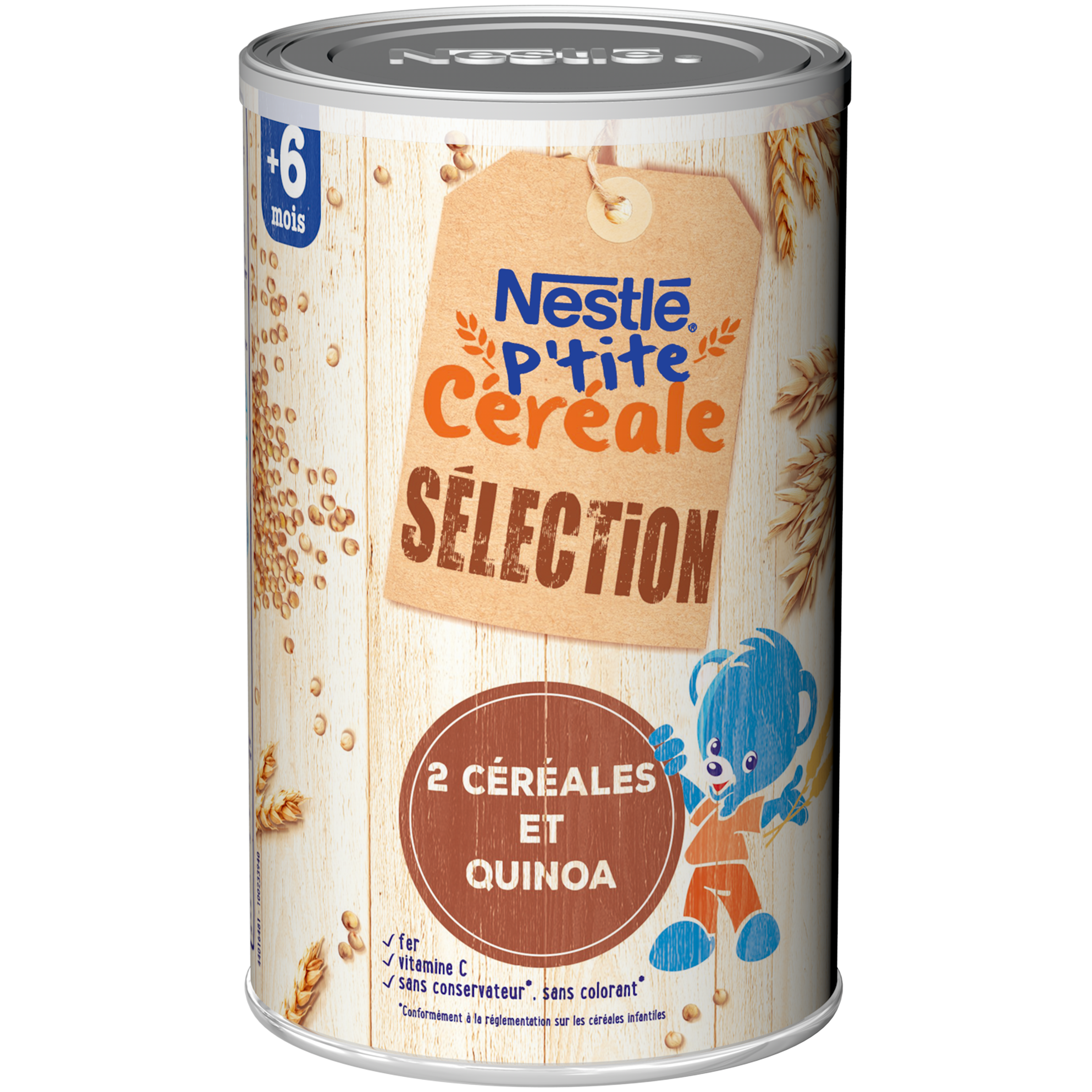 Céréale infantile pour nourrissons et enfants en bas âge Nestlé P’tite Céréale Sélection 6M propose la découverte de nouveaux goûts avec le Quinoa. Ce produit permet d'introduire en douceur le gluten dans l'alimentation de bébé et de compléter son biberon de lait pour bien démarrer la journée avec un petit-déjeuner complet et équilibré. Le saviez-vous ? Dès 6 mois, 1 biberon seul peut ne plus suffire à couvrir les besoins nutritionnels du petit déjeuner. C'est le moment d'introduire les céréales.Veiller à respecter l'appétit de votre bébé.