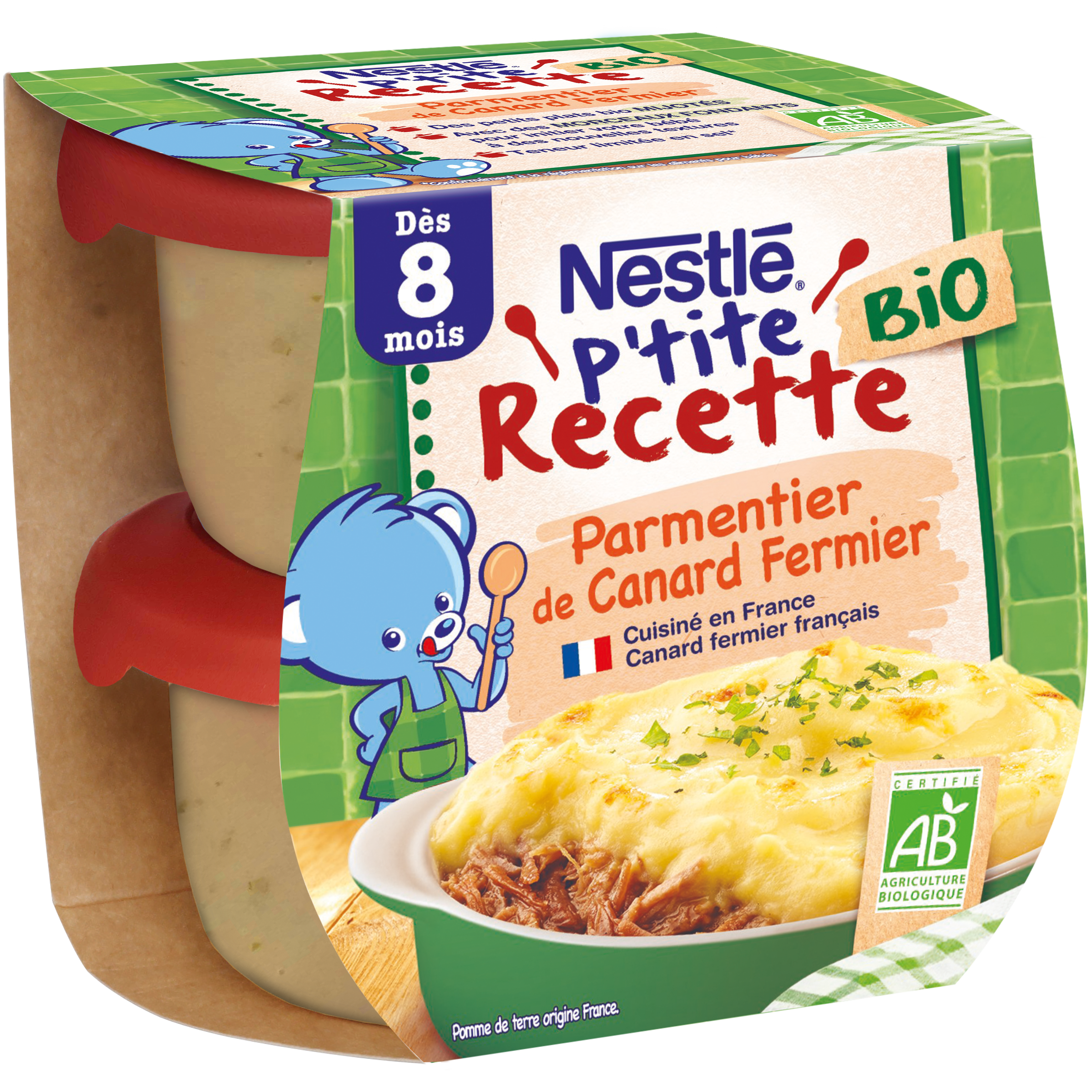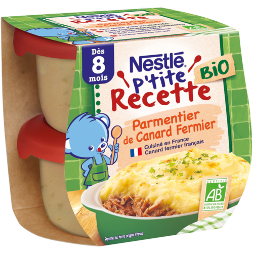 Faites découvrir à bébé un grand classique de la cuisine française originaire du Sud Ouest et adapté à son âge* avec NESTLÉ P'tite Recette Bio Parmentier de Canard Fermier. Une recette avec des morceaux fondants pour initier bébé à de nouvelles textures. De la viande de canard mélangée avec des pommes de terre et une touche de persil pour éveiller bébé à de nouvelles saveurs. Des ingrédients issus de l'agriculture biologique participant au respect de l'environnement et de la biodiversité.** Canard fermier français. Cuisiné en France. C'est toujours sous la surveillance permanente d'un adulte que votre bébé peut savourer ce plat. Veillez à respecter l'appétit de votre bébé. *Conformément à la réglementation sur les aliments pour bébés. Pommes de terre origine France. **conformément à la réglementation sur l'agriculture biologique