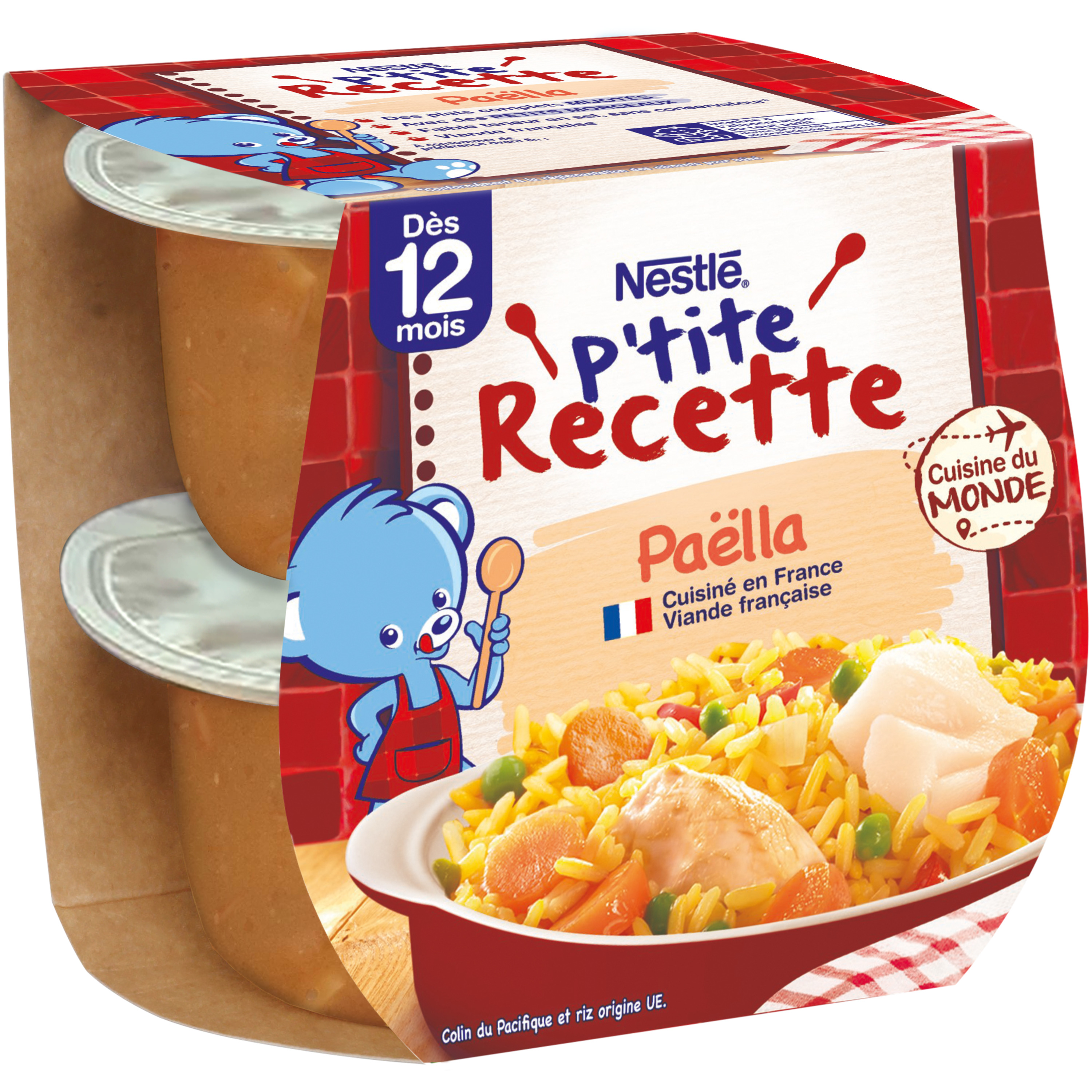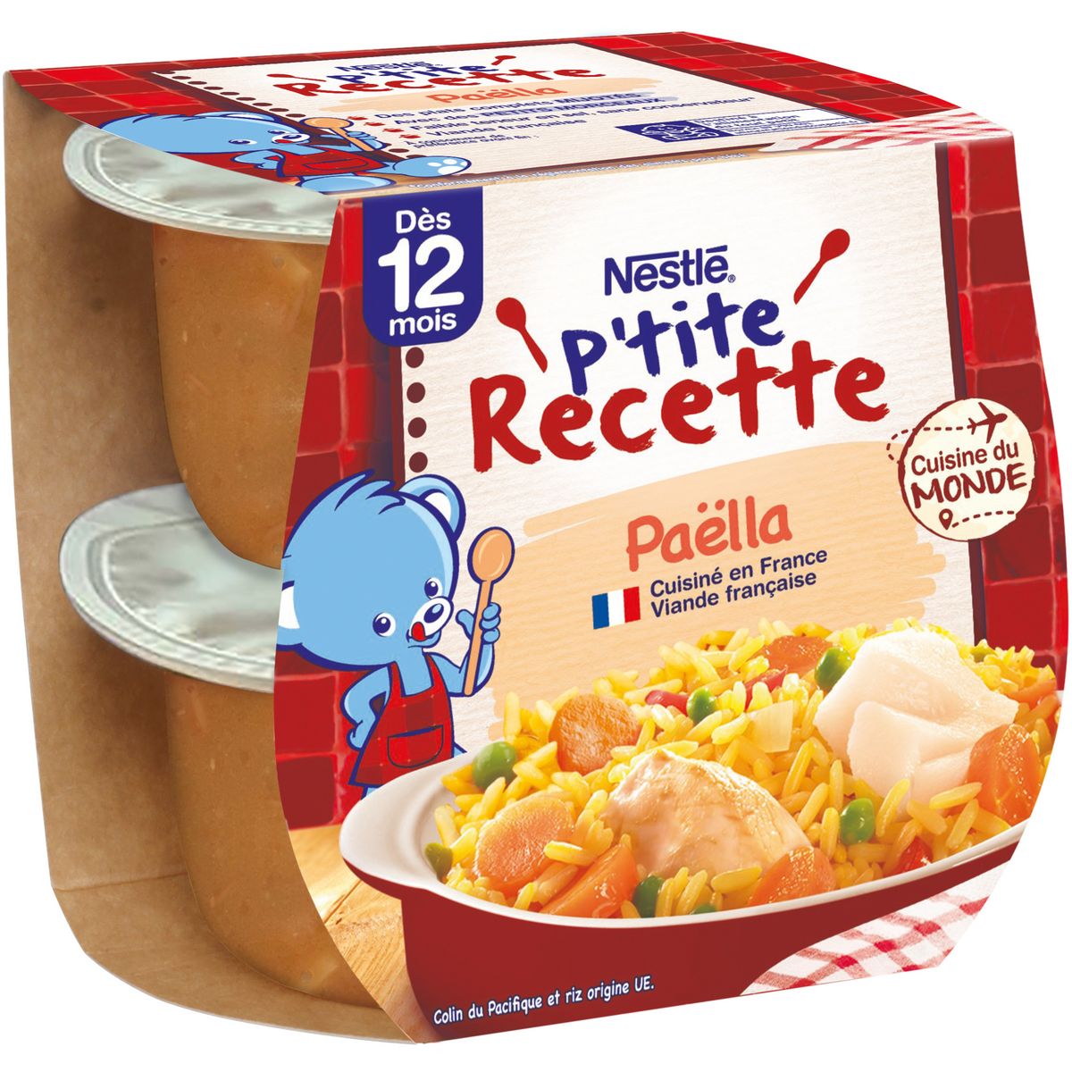 Faites voyager votre bébé avec notre petit plat pour bébé P'tite Recette Paëlla : en route pour l'Espagne ! Un délicieux petit plat adapté à bébé dès 12 mois* avec des petits morceaux pour continuer la découverte des textures. Des légumes, de la dinde et du poisson mijotés avec du riz, le tout parfumé au curcuma pour éveiller bébé à de nouvelles saveurs ensoleillées. Une recette cuisinée en France avec de la volaille française. Ensemble participons à la transition écologique : nous avons retiré les couvercles de nos pots afin de réduire de 40% le plastique par pot** ! Colin origine Pacifique et riz origine UE.