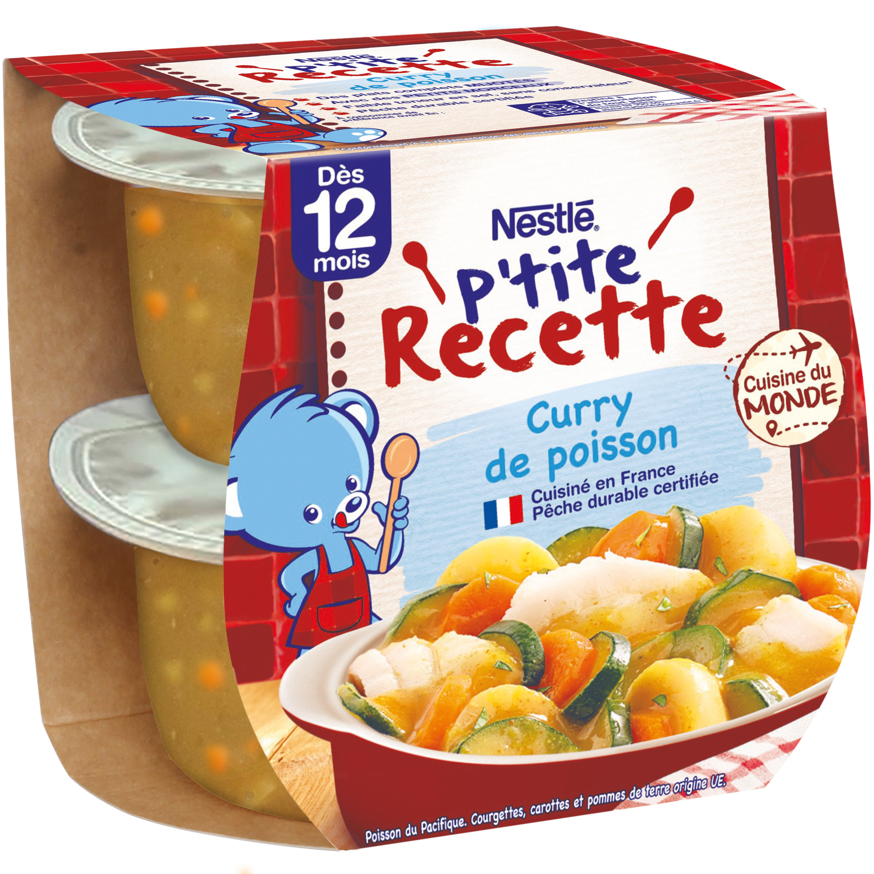 Découvrez notre petit plat pour bébé P'tite Recette Curry de Poisson: un voyage culinaire en Inde, spécialement adapté pour bébé dès 12 mois avec des petits morceaux pour initier bébé à de nouvelles textures. Du poisson et des légumes mijotés avec du cumin et du curcuma pour éveiller bébé à de nouvelles saveurs orientales. Une recette cuisinée en France avec du poisson issu d'une pêche durable certifiée. Poisson du Pacifique. Courgettes, carottes et pommes de terre origine UE.