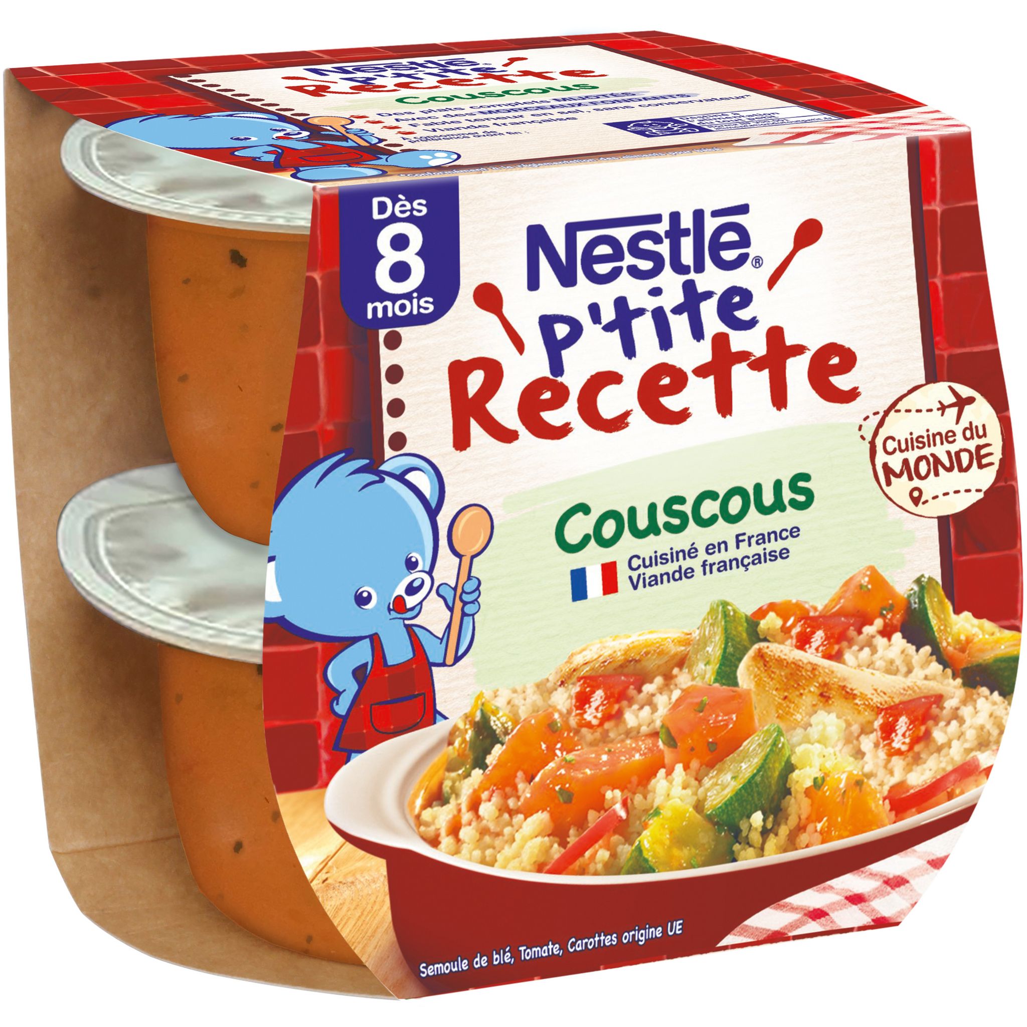 Faites voyager votre bébé avec notre petit plat pour bébé P'TITE RECETTE Coucous : décollage vers le Maghreb ! Un délicieux petit plat adapté à bébé dès 8 mois* avec des morceaux fondants pour initier bébé à des nouvelles textures. Des légumes et du poulet mijotés avec des oignons, de l'ail et du persil mélangés avec de la semoule pour éveiller bébé à de nouvelles saveurs marocaines. Une recette cuisinée en France avec de la volaille française. Ensemble participons à la transition écologique : nous avons retiré les couvercles de nos pots afin de réduire de 40% le plastique par pot** ! Semoule de blé origine UE.