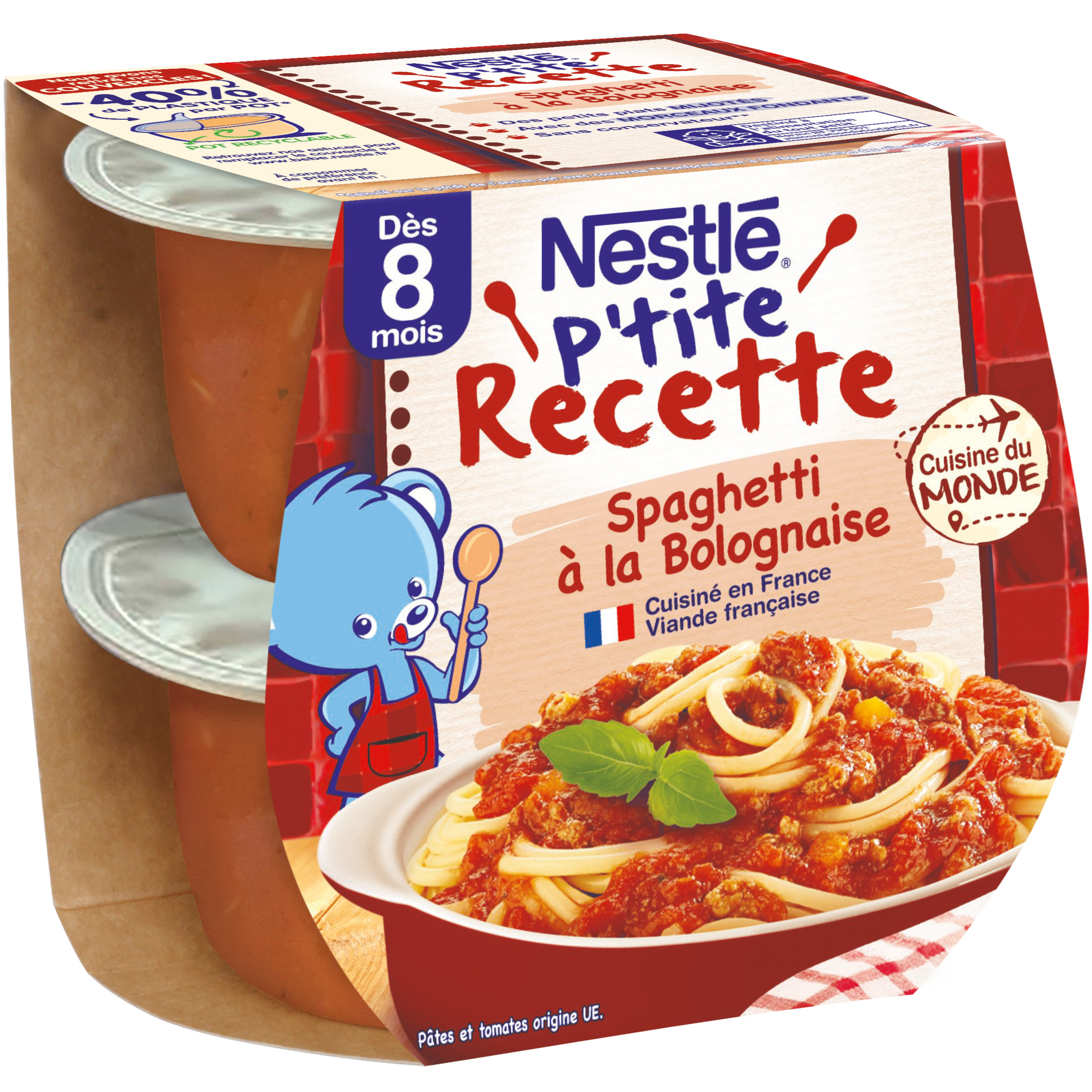 Faites voyager bébé avec P'TITE RECETTE Spaghetti à la Bolognaise : excursion en Italie ! Un petit plat mijoté conçu exprès pour bébé* avec des morceaux fondants pour initier bébé à des nouvelles textures. Des légumes, de la viande hachée mijotés avec une sauce tomate, de l'origan et du thym accompagnés de spaghettis fondants avec une touche de basilic pour éveiller bébé à de nouvelles saveurs italiennes. Une recette cuisinée en France avec de la viande de boeuf française. C'est toujours sous la surveillance permanente d'un adulte que votre bébé peut savourer ce plat. Veillez à respecter l'appétit de votre bébé.Pâtes et tomates origine UE.
