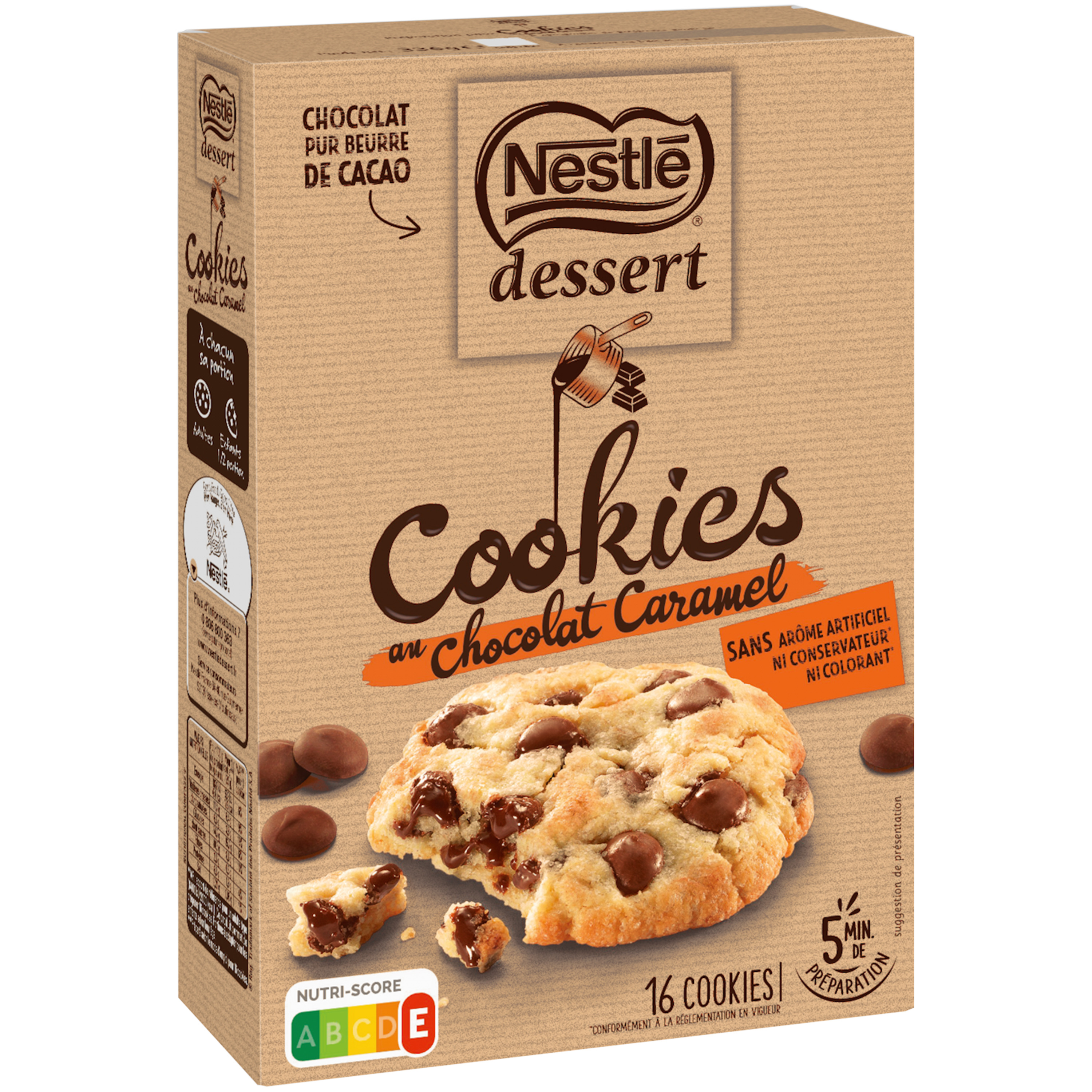 Ingrédients: Sachet de chocolat au lait au caramel (110 g) : sucre, pâte de cacao, beurre de cacao, LAIT entier en poudre, caramel 5% (PETIT-LAIT, BEURRE, maltodextrine, sucre, LAIT écrémé), PETIT-LAIT filtré en poudre, arôme naturel, arôme naturel de vanille, émulsifiant : lécithine de tournesol. Cacao : 37% minimum. Sachet de préparation pour cookies (226 g) : farine de BLE, sucre, poudre à lever : diphosphates et carbonates de sodium. Peut contenir : LAIT.