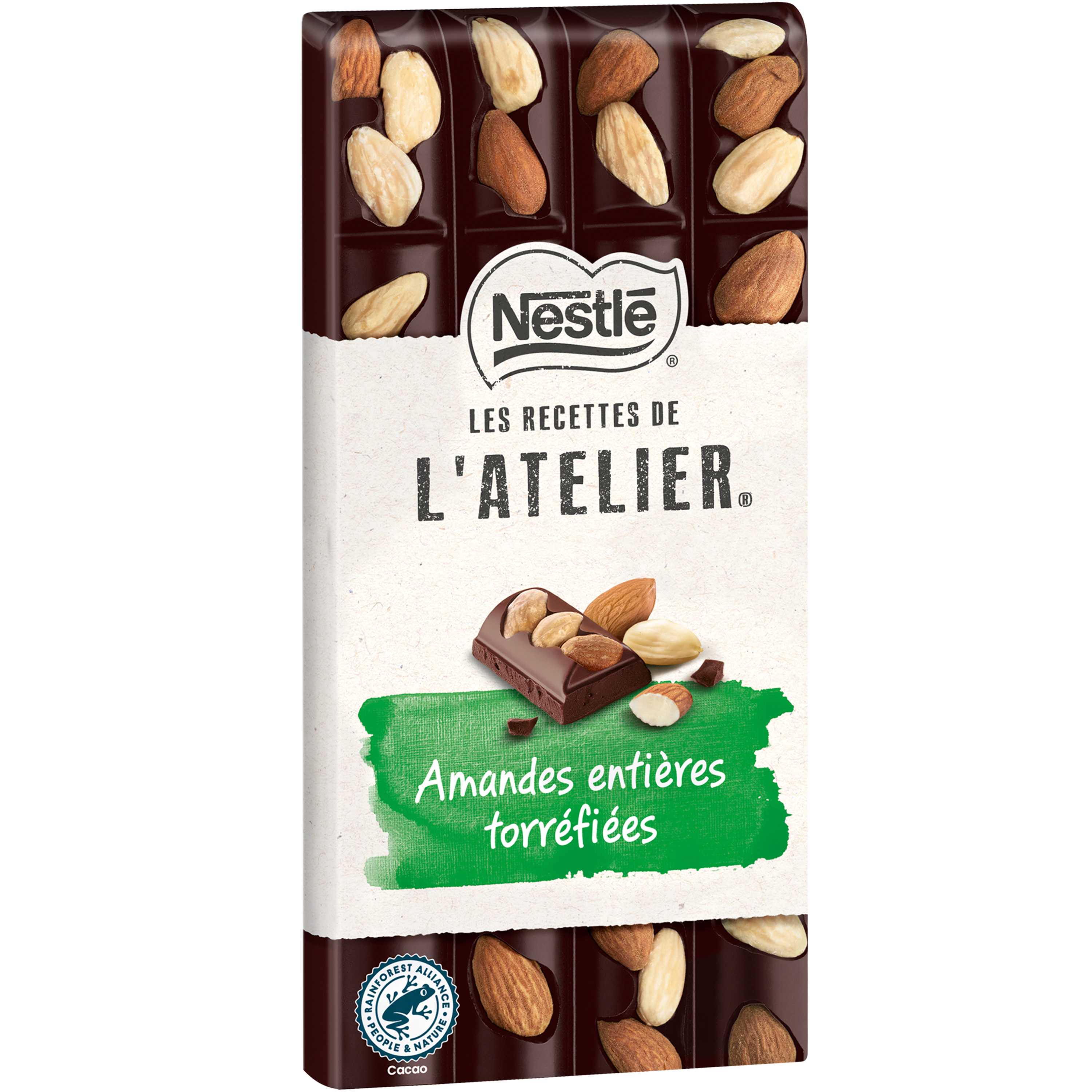 Laissez-vous tenter par un chocolat noir fondant sublimé par de délicieuses amandes entières délicatement torréfiées. Un chocolat pur beurre de cacao et sans arôme artificiel. Et comme il n'y a pas de grand chocolat sans grand cacao, nos fèves de cacao sont soigneusement sélectionnées et issues de plantations certifiées Rainforest Alliance.