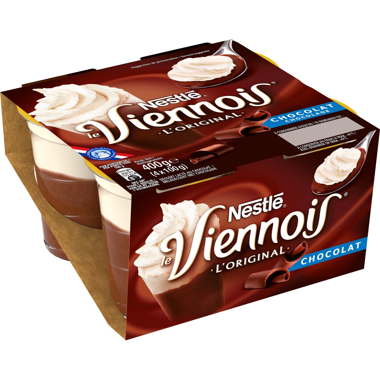 Dessert lacté au chocolat Le Viennois Chocolat de Nestlé, c'est l'alliance parfaite entre une onctueuse crème dessert au chocolat et un délicat tourbillon fouetté. Le Viennois Chocolat de Nestlé est un dessert liégeois fabriqué en France avec du lait Origine France.