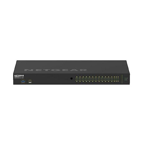 Le commutateur réseau Netgear AV Line M4250 (modèle GSM4230P-100EUS) est un commutateur géré conçu pour les installations audiovisuelles sur IP et les réseaux professionnels. Il offre 26 ports RJ-45 Gigabit Ethernet, dont 24 ports avec PoE+ fournissant un budget total de 300W pour alimenter des disp