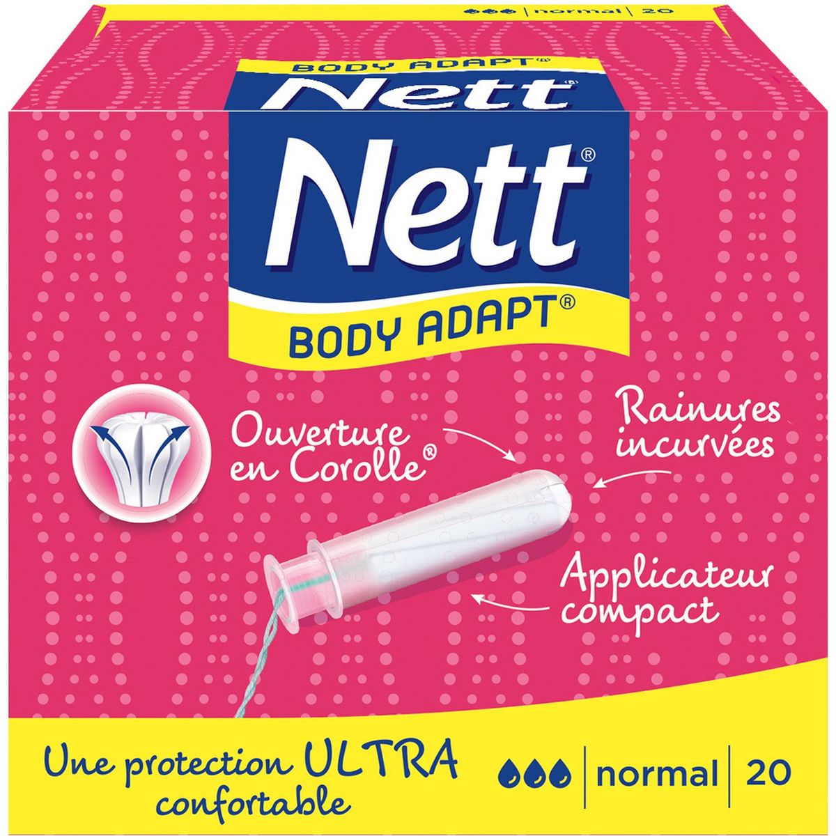 Les tampons NETT® BODY ADAPT® Normal sont adaptés au flux moyen. Grâce à son ouverture en Corolle®, NETT® BODY ADAPT® se dilate tout en douceur pour s'adapter à votre corps. Ainsi il vous apporte une protection fiable et ultra confortable.