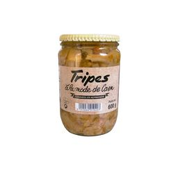 Ingrédients : estomacs et pieds de bœuf 73%, fond de sauce : eau, carottes, oignons, vin aromatisé, sel, calvados, extraits naturels d’épices et d’aromates, acidifiant : acide citrique, pulpe d’ail.