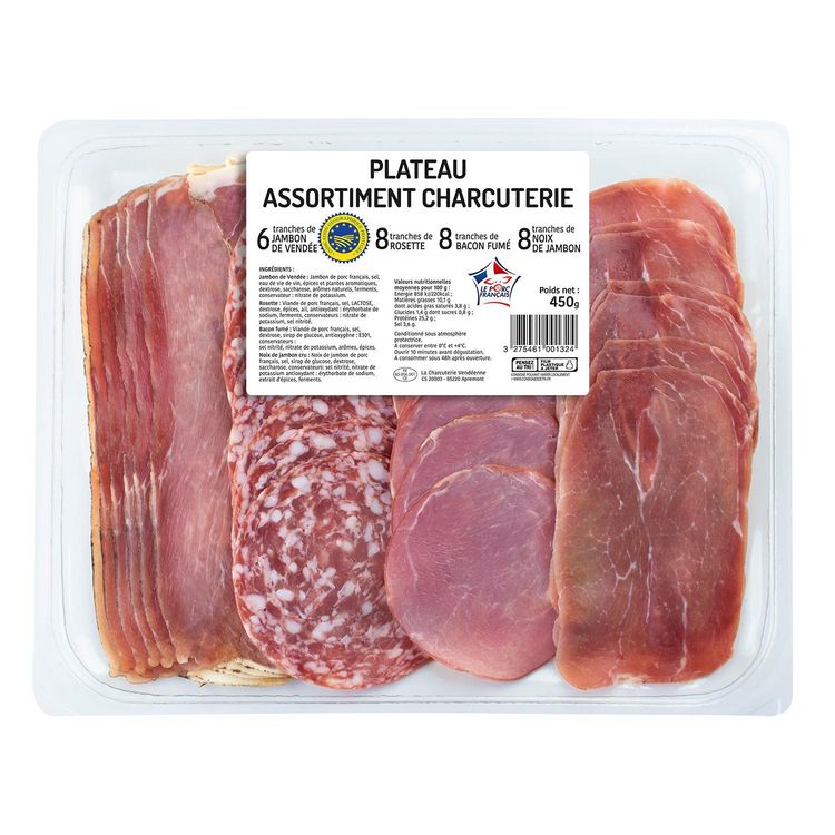 0,450 kg6 tranches de jambon de Vendée, 8 tranches de Rosette, 8 tranches de Bacon fumé, 8 tranches de noix de jambon