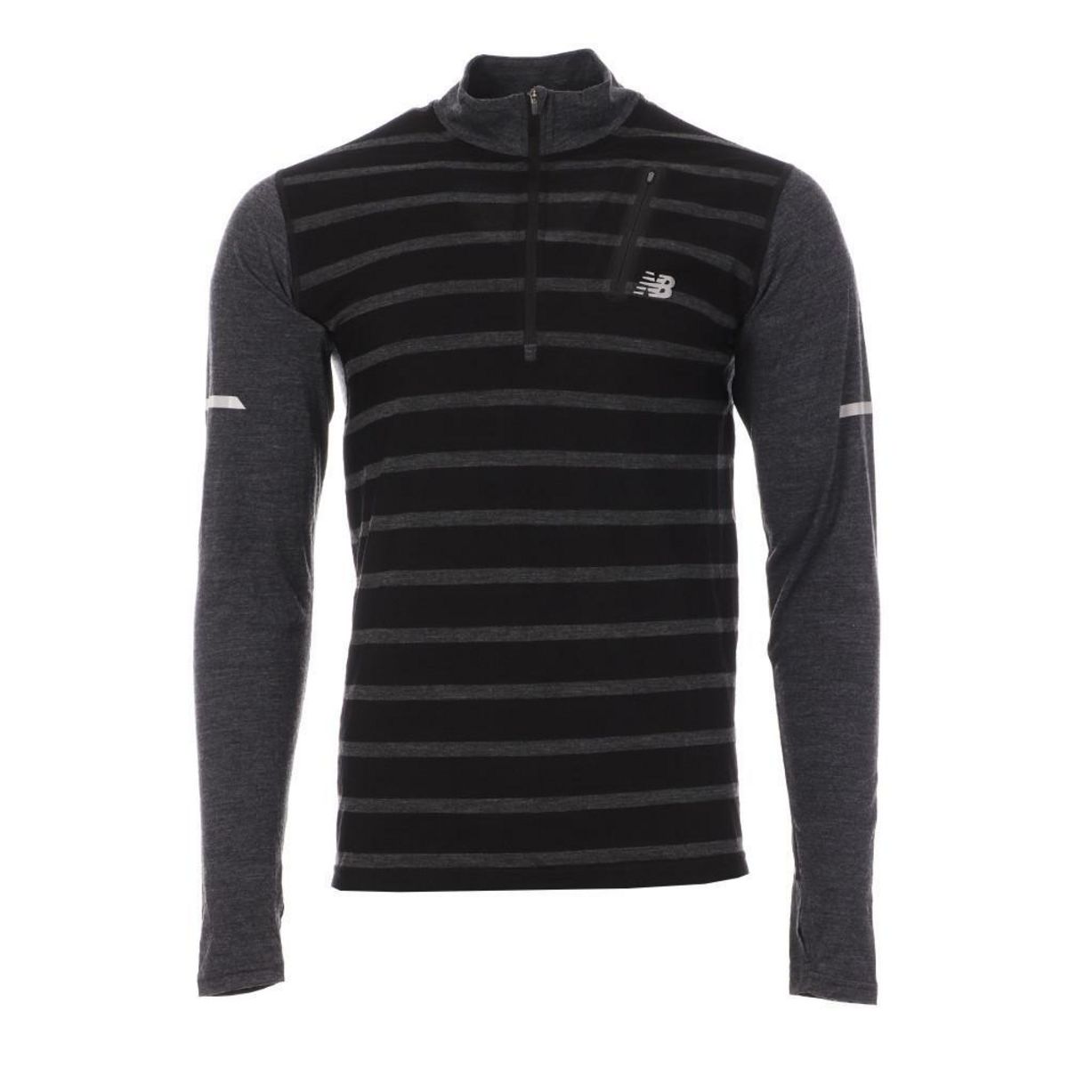 Sweat 1/2 zip pour homme de la marque New Balance ! Couleur : Noir/Gris Coupe ajustée Col 1/2 zip Poche poitrine zippée Logo NB imprimé Détails réfléchissants Composition : 65% laine, 35% polyester