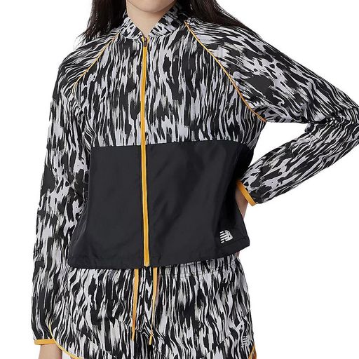 Veste de sport pour femme de la marque New Balance ! Couleurs : Noir/Gris/Orange Coupe ajustée Col montant Fermeture zippée Motifs imprimés Poches latérales zippées Logo NB imprimé Composition : 100% polyester