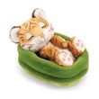 DOUX ET MIGNON : Bébé tigre endormi en peluche NICI avec corps rayé et yeux brodés ? allongé tranquillement dans un panier en peluche vert clair, idéal pour les câlins, les jeux et les moments de tendresse