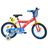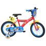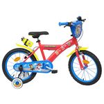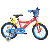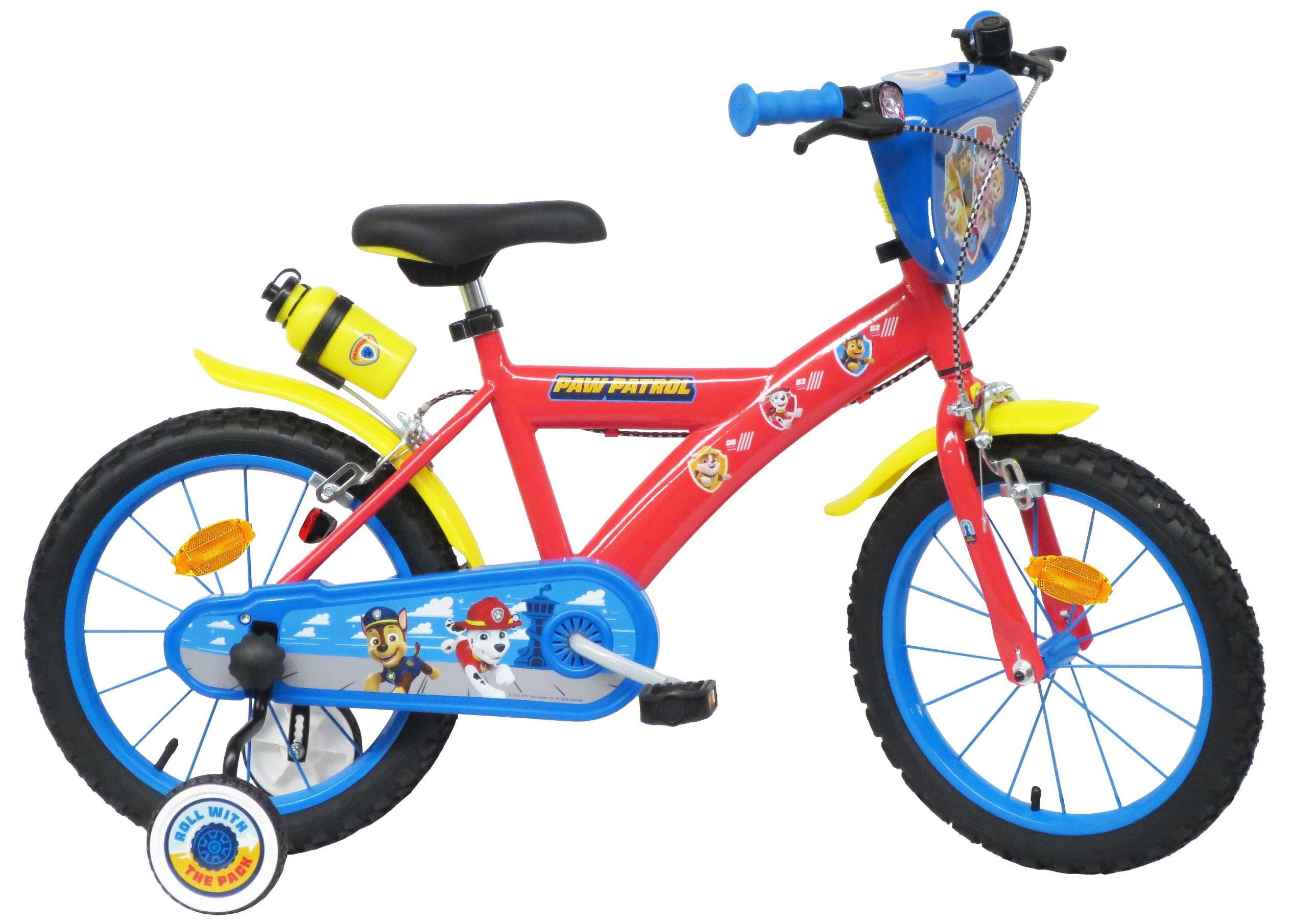 Vélo 16 Garçon Licence Pat Patrouille pour enfant de 105/120 cm - Cadre Acier - Direction et pédalier en nylon - Roue libre monovitesse - Freins avant et arrière Calliper -Selle réglable - Carter de chaîne intégral - Gardes boue et poignées spécifiques pour augmenter la protection de l'enfant - Jantes à rayons - Pneus gonflables noirs - Stabilisateurs (montage sans outil) - Plaque décorative avant - Porte bidon - Gourde - Avertisseur sonore - Eclairage à piles fournies - Catadioptres de roues