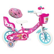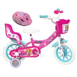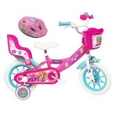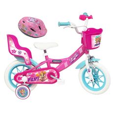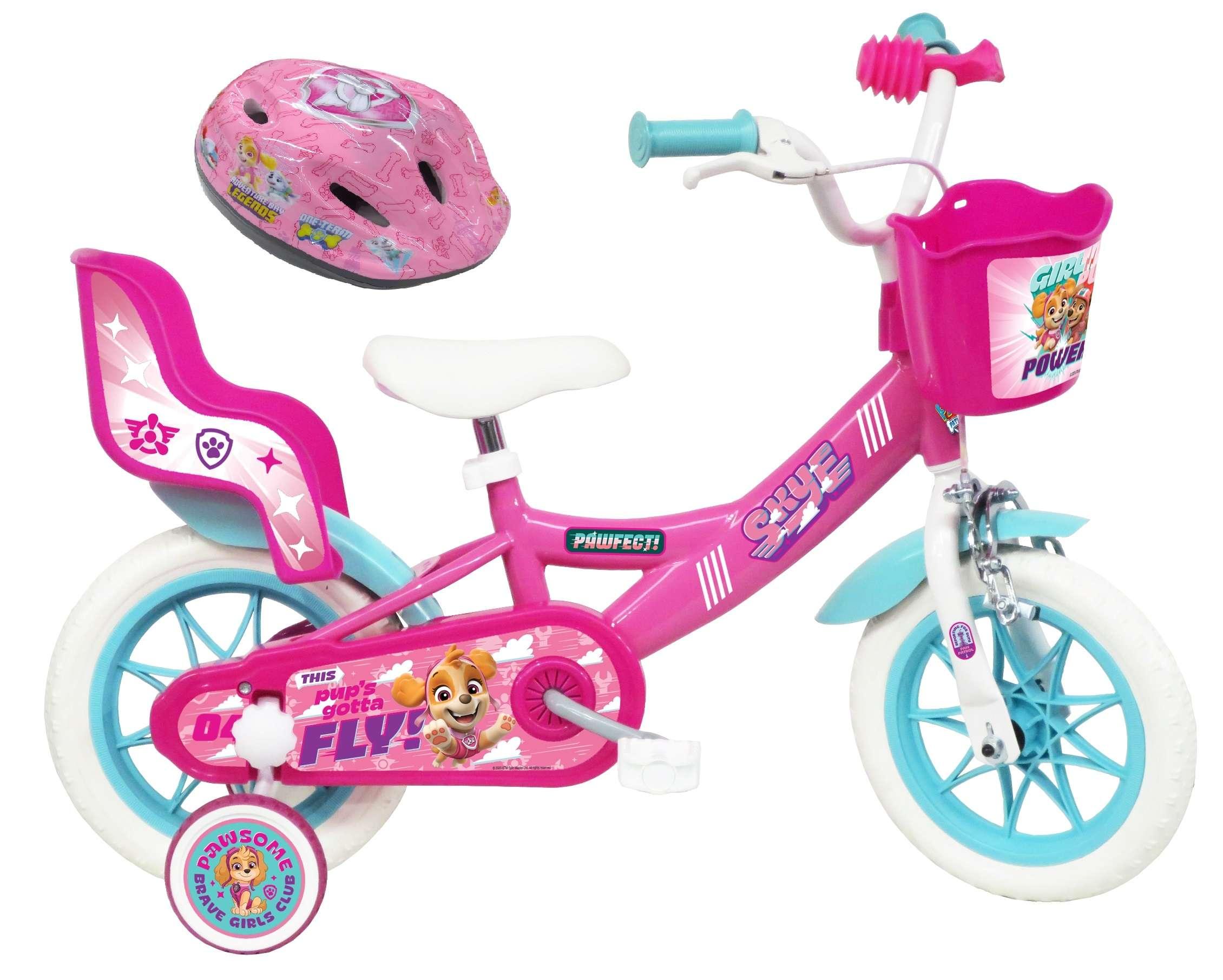 Vélo enfant - Modèle 12'' Pat Patrouille à l'effigie de Stella + Casque pour enfant de 85/100 cm avec stabilisateurs - Panier avant - Porte poupée - 1 frein et roues à bâtons