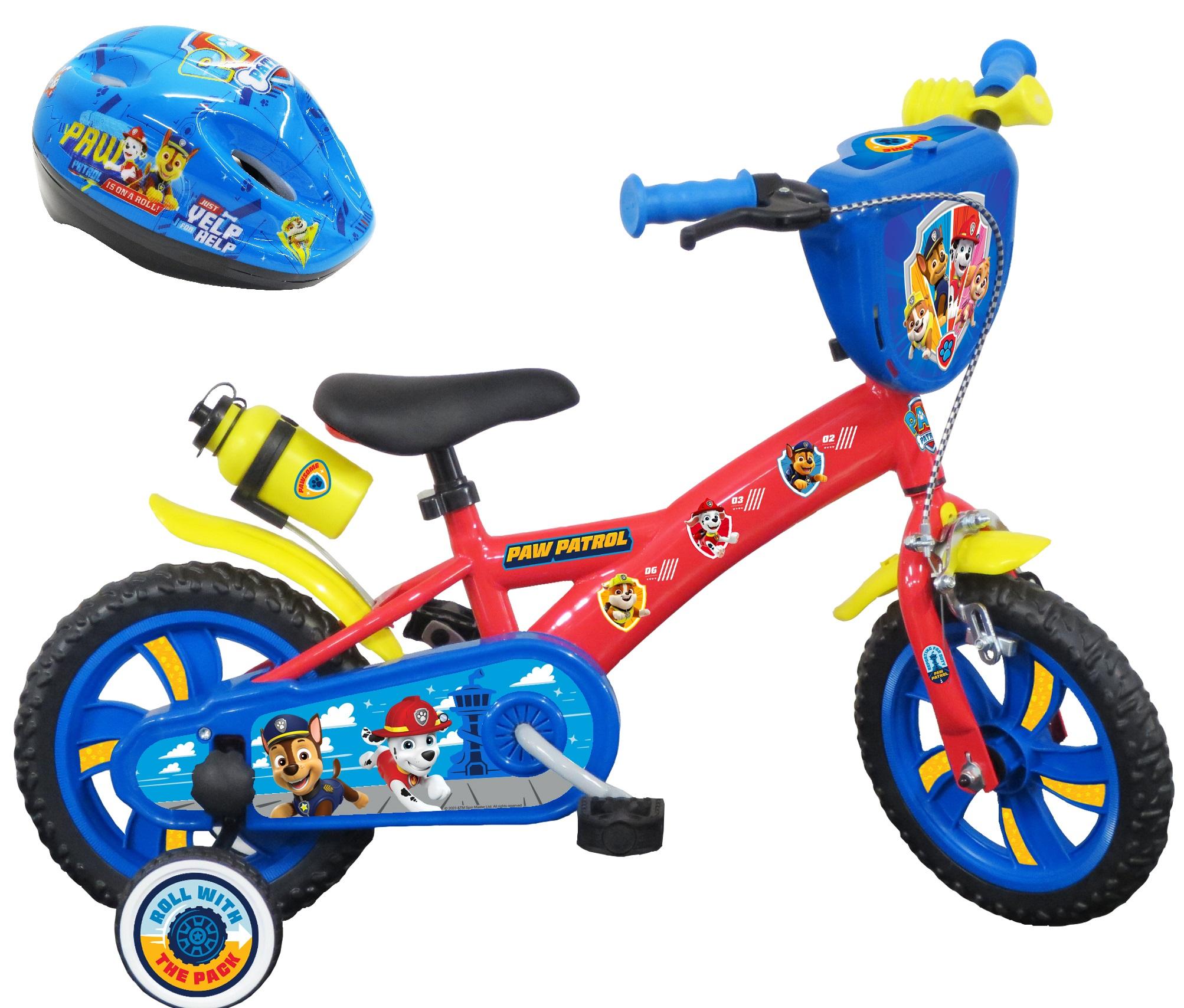 Vélo enfant - Modèle 12'' Pat Patrouille + Casque pour enfant de 85/100 cm avec stabilisateurs - Plaque décorative avant - Porte bidon - 1 frein et roues à bâtons