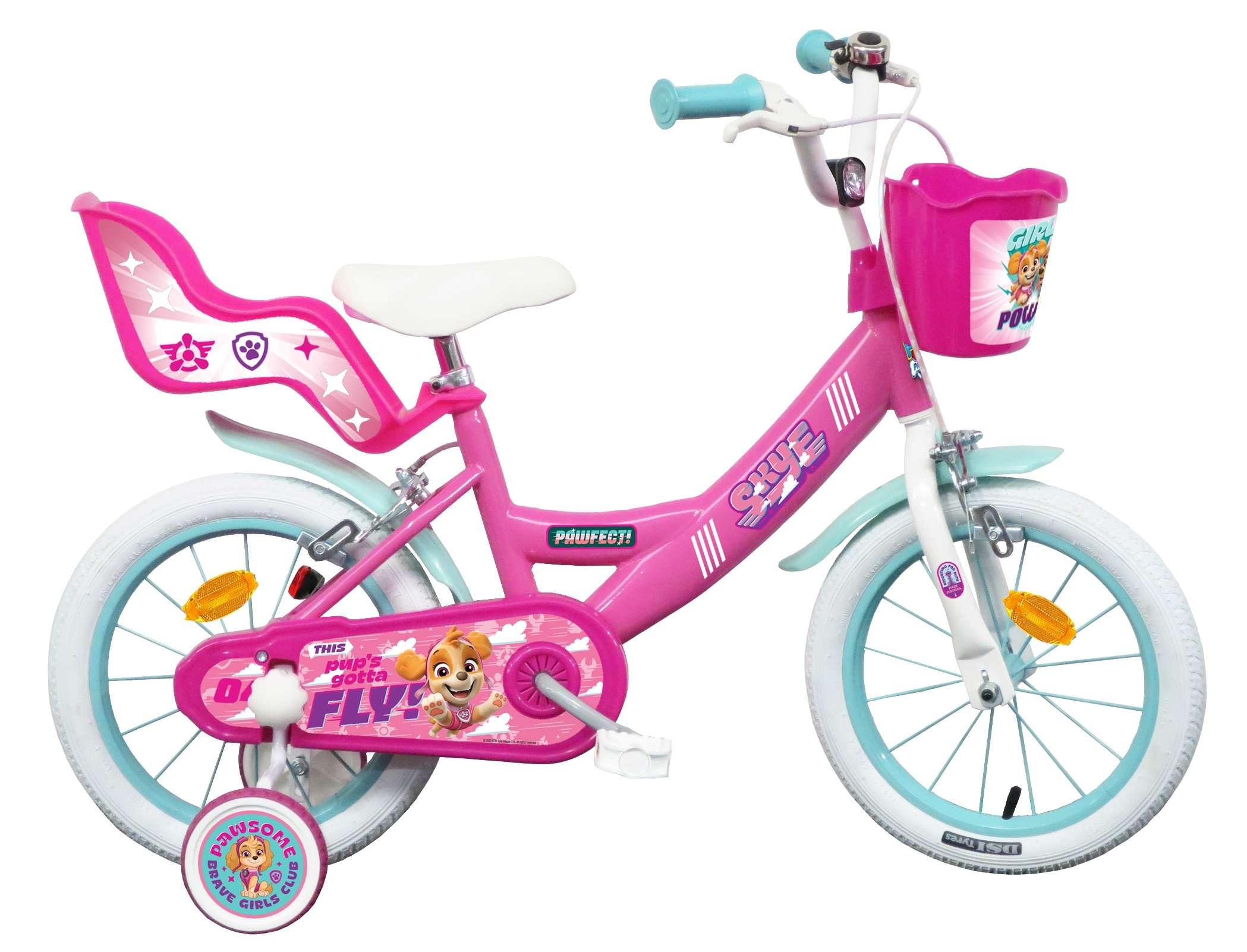Vélo enfant - Modèle 14'' Pat Patrouille à l'effigie de Stella pour enfant de 95/110 cm avec stabilisateurs - Panier avant - Porte poupée arrière - 2 freins