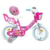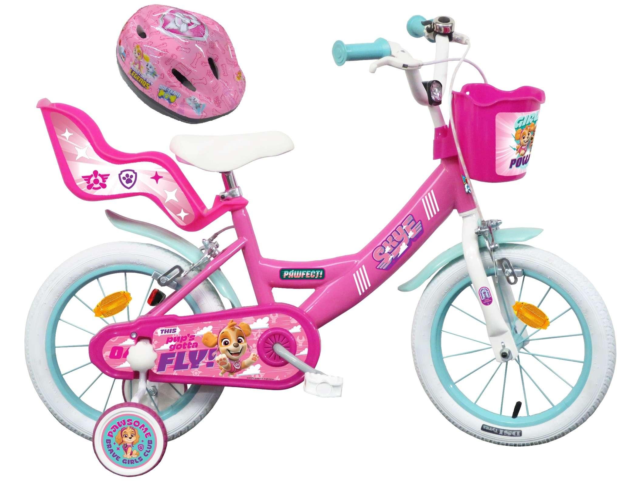 Vélo enfant - Modèle 16'' Pat Patrouille à l'effigie de Stella + Casque pour enfant de 105/120 cm avec stabilisateurs - Panier avant - Porte poupée arrière - 2 freins