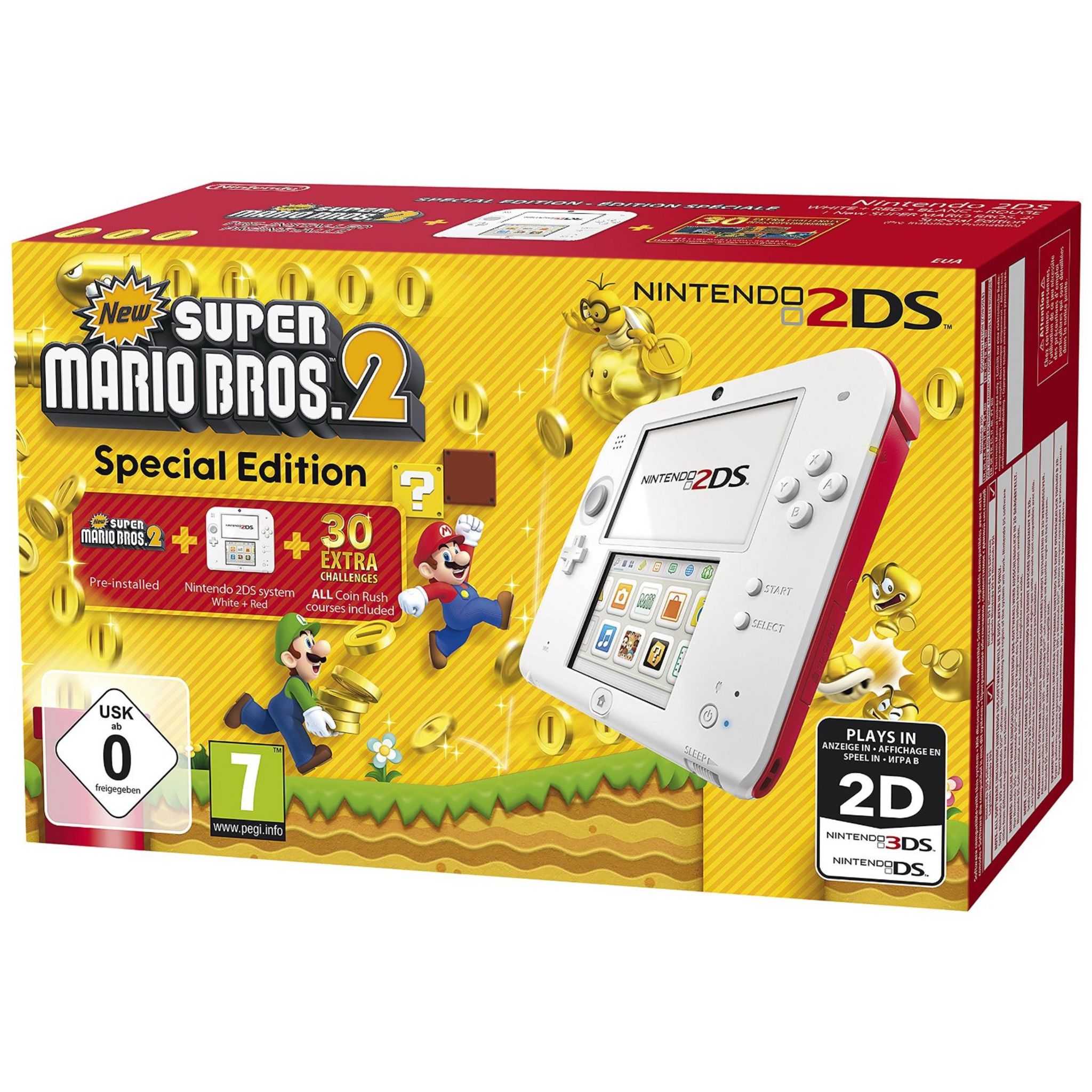 Le pack New Super Mario Bros. 2 édition spéciale est composé d'une Nintendo 2DS BLANC + ROUGE, d'un exemplaire de New Super Mario Bros. 2 préinstallé sur une carte mémoire de 4 Go, et de l'accès à l’ensemble des contenus supplémentaires du mode "Pièces en folie" publiés depuis la sortie du jeu en août 2012.