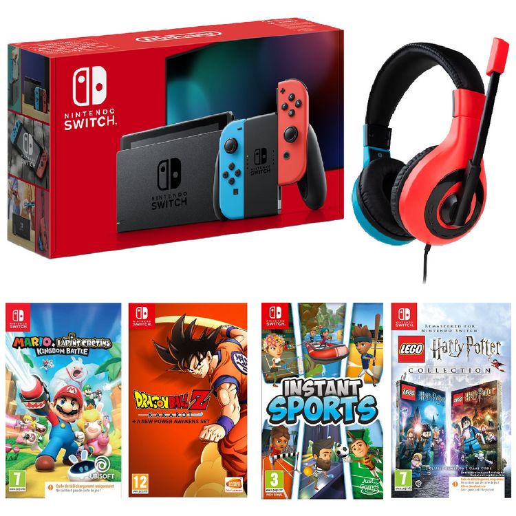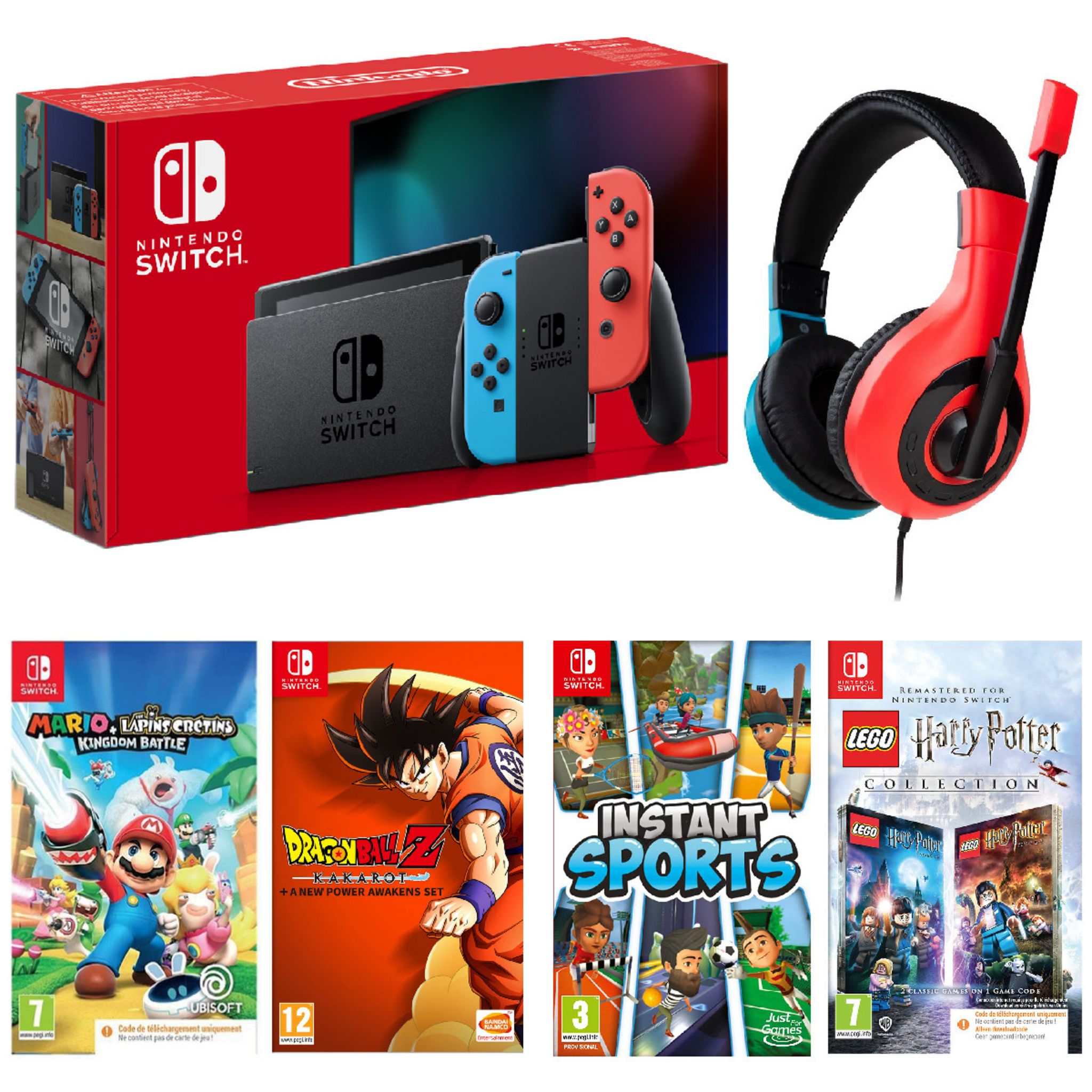 Console Nintendo Switch Joy-Con Bleu et Rouge + Mario The Lapin Crétins Kingdom Battle + Dragon Ball Z Kakarot + Instant Sports + LEGO Harry Potter Collection - Années 1 à 7 + Casque Gamer Filaire V1 Rouge et Bleu