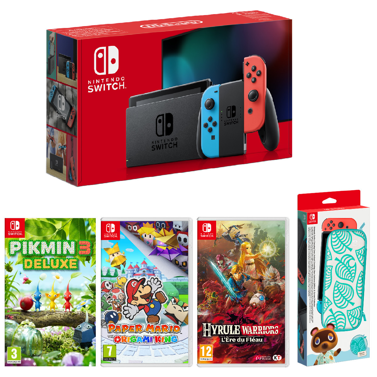 Console Nintendo Switch Néon + Pikmin 3 + Paper Mario: The Origami King + Hyrule Warriors: L'ère du Fléau + Pochette de transport et protection d'écran Animal Crossing Nintendo Switch