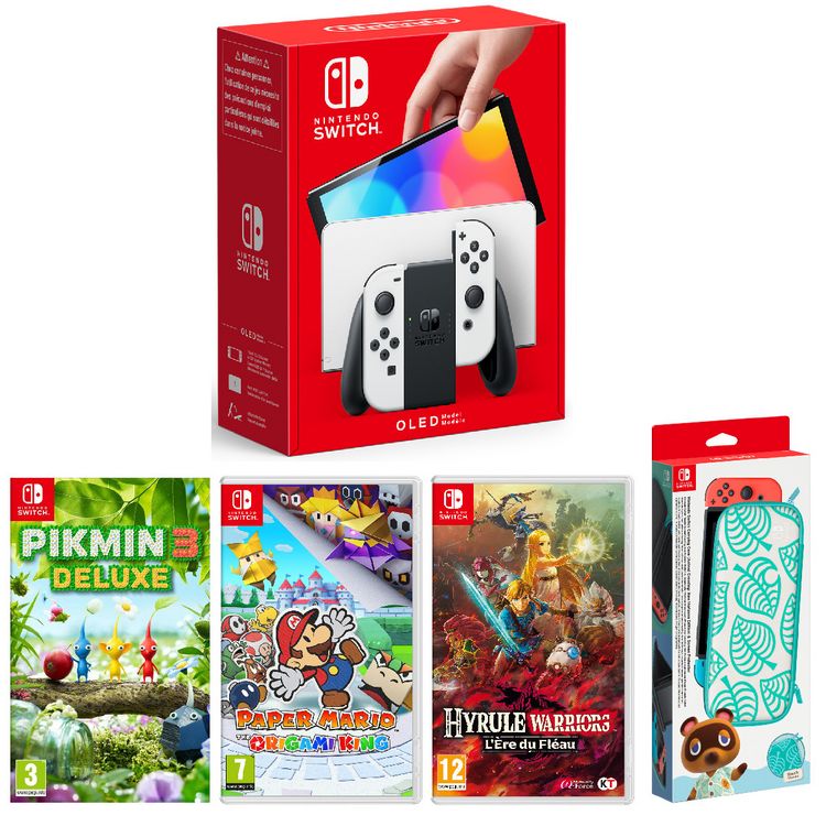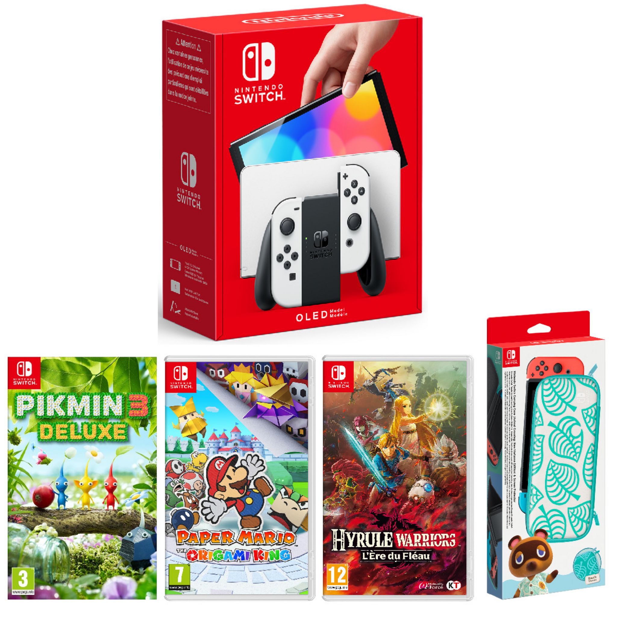 Console Nintendo Switch OLED Blanche + Pikmin 3 + Paper Mario: The Origami King + Hyrule Warriors: L'ère du Fléau + Pochette de transport et protection d'écran Animal Crossing Nintendo Switch