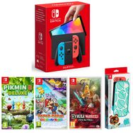Console Nintendo Switch OLED Néon + Pikmin 3 + Paper Mario: The Origami King + Hyrule Warriors: L'ère du Fléau + Pochette de transport et protection d'écran Animal Crossing Nintendo Switch