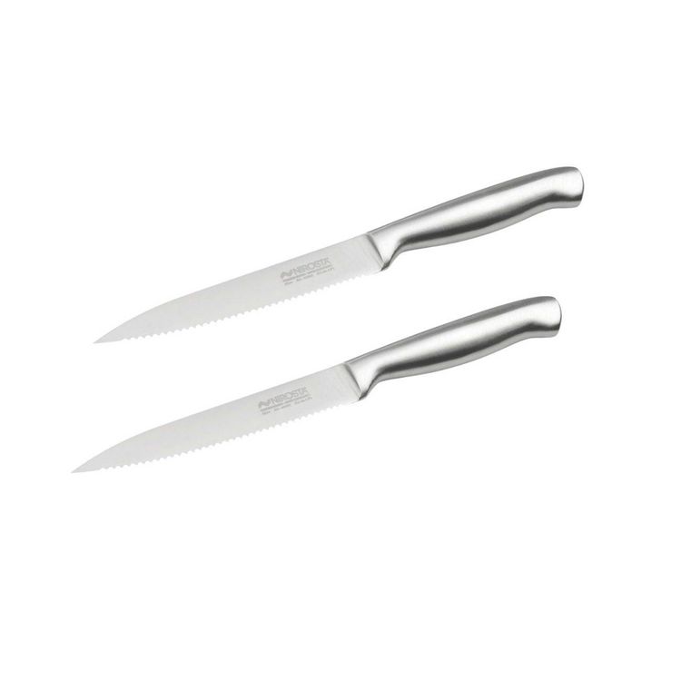 Découvrez ce lot de 2 couteaux de cuisine professionnels Nirosta, chacun doté d'une lame crantée de 24 cm. Idéals pour trancher facilement des fruits et légumes à peau dure, ainsi que des gâteaux sans les émietter. Fabriqués en acier inoxydable, ces couteaux garantissent une grande résistance et une