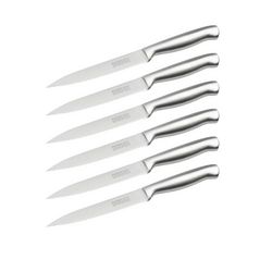 Découvrez ce lot de 6 couteaux de cuisine professionnels Nirosta, parfaits pour toutes vos préparations. Chaque couteau mesure 24 cm et possède une lame crantée, idéale pour découper avec précision fruits, légumes et gâteaux sans les émietter. Fabriqués en acier inoxydable, ils offrent une grande ré