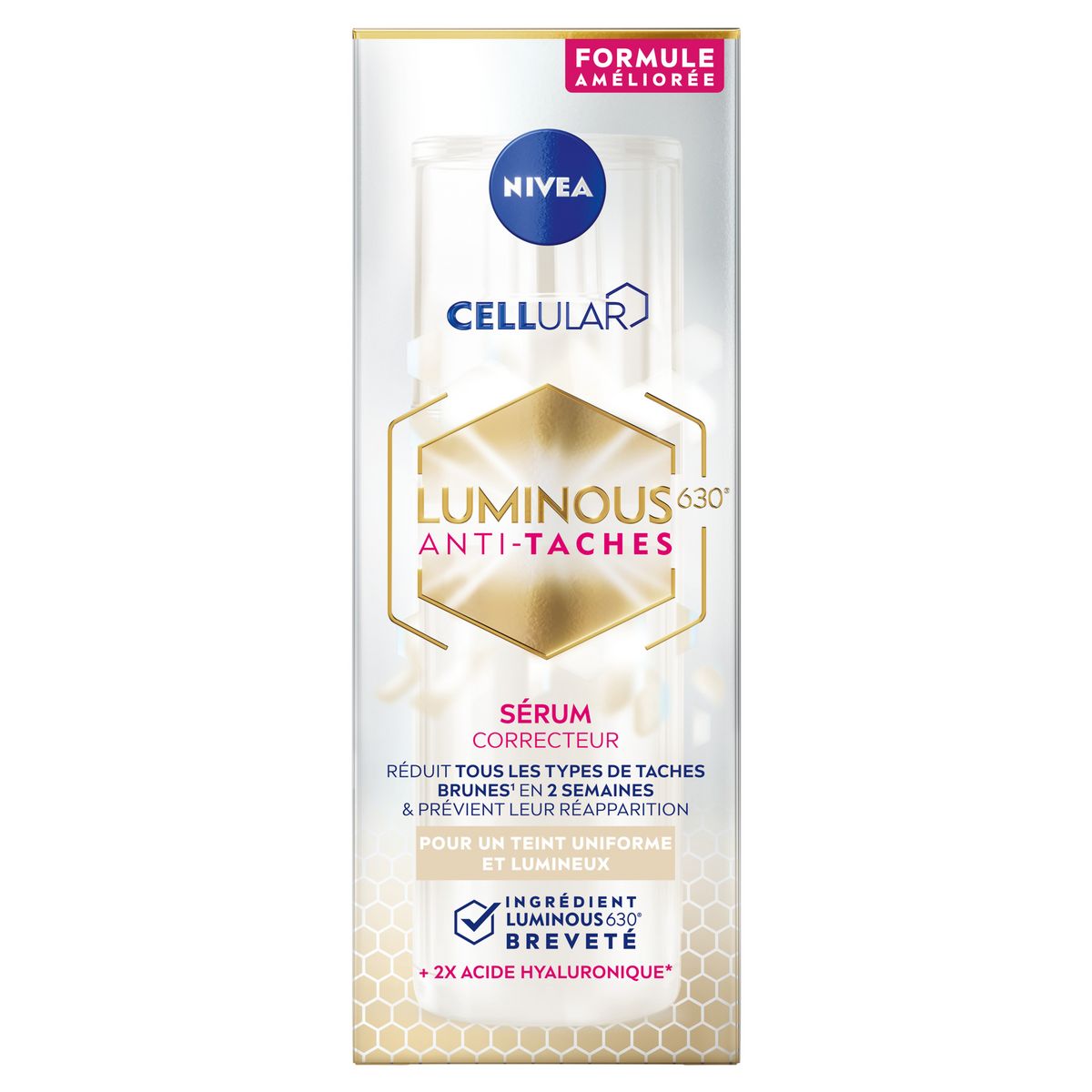 Après 10 ans de recherche, les laboratoires NIVEA ont découvert un ingrédient puissant : LUMINOUS630®. Il agit sur la pigmentation existante de la peau pour éclaircir les taches brunes et prévenir l'apparition de nouvelles. En 4 semaines, les taches sont visiblement éclaircies, le teint est uniforme et lumineux (les résultats individuels peuvent varier).