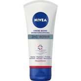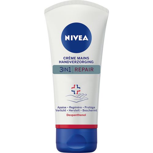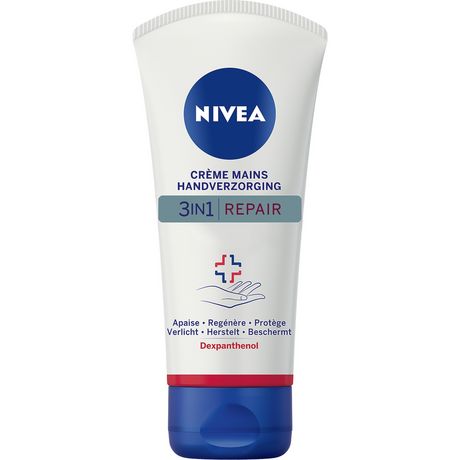 La Crème Mains 3-en-1 Repair NIVEA est enrichie en Dexpanthenol pour apaiser instantanément les sensations de sécheresses et les rugosités. La Crème Mains 3 en 1 pour peaux très sèches et rugueuses a une formule riche non-grasse qui hydrate, régénère et protège durablement la peau des mains. Dès la première application, elle soulage les mains très sèches et rugueuses.