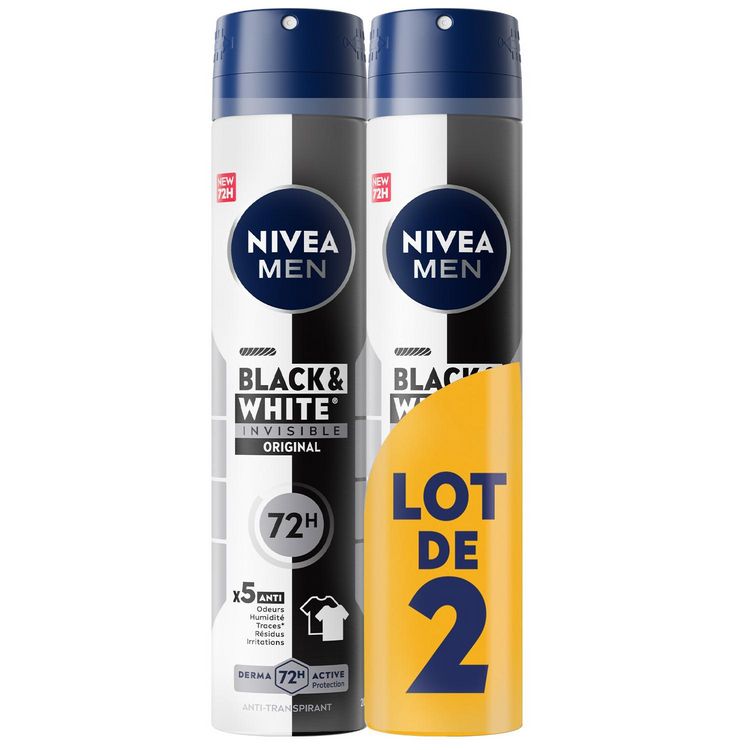 Le déodorant spray NIVEA MEN Black & White Original est un anti-transpirant qui protège efficacement pendant 72h contre les odeurs de transpiration tout en prenant soin de votre peau et de vos aisselles. Il offre une protection contre les odeurs, l'humidité, les résidus, et les irritations. Il ne laisse pas de traces blanches sur les vêtements noirs ni de traces jaunes sur les vêtements blancs. Sèche rapidement. Formulé sans alcool (sans éthanol). Tolérance cutanée testée sous contrôle dermatologique. Format spray 200 ml. Existe aussi en format bille 50 ml. Conseils d’utilisation : vaporisez à 15 cm de l'aisselle et laissez sécher avant de vous habiller.