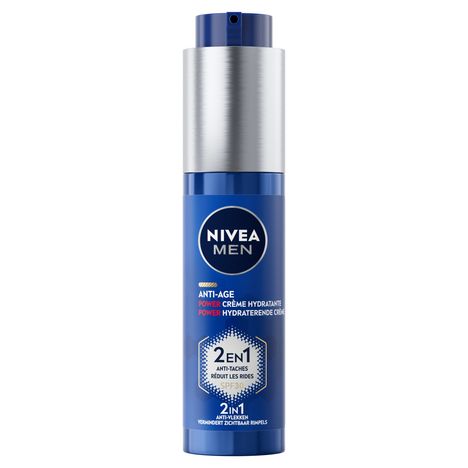 La crème visage POWER 2 en 1 NIVEA MEN Anti-Âge et Anti-Taches à l'acide hyaluronique aide à réduire visiblement les rides profondes et à raffermir efficacement votre peau. Sa formule contient aussi un ingrédient anti-pigment breveté THIAMIDOL®, qui assure une protection solaire et prévient l'apparition de taches brunes et de taches de vieillesse sur la peau. Grâce à la composition de la crème visage à l'acide hyaluronique et à un ingrédient breveté THIAMIDOL®, le soin réalise une action 2 en 1 en réduisant les rides tout en éclaircissant les taches brunes. Le FPS 30 aide à prévenir la formation de rides causées par le soleil. Son effet anti-âge activateur de cellules avec l'acide hyaluronique renforce l'élasticité de la peau pour une apparence plus jeune en seulement 4 semaines. Auto-évaluation (score), 64 hommes, 2022