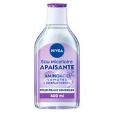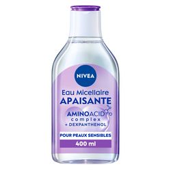 L’Eau Micellaire Apaisante NIVEA est spécialement formulée pour nettoyer en profondeur et en douceur les peaux sensibles. Avec son extrait de Licorice, Panthénol et Complexe Amino Acide, elle élimine le maquillage, les impuretés et les filtres UV sans frotter et sans rincer.
