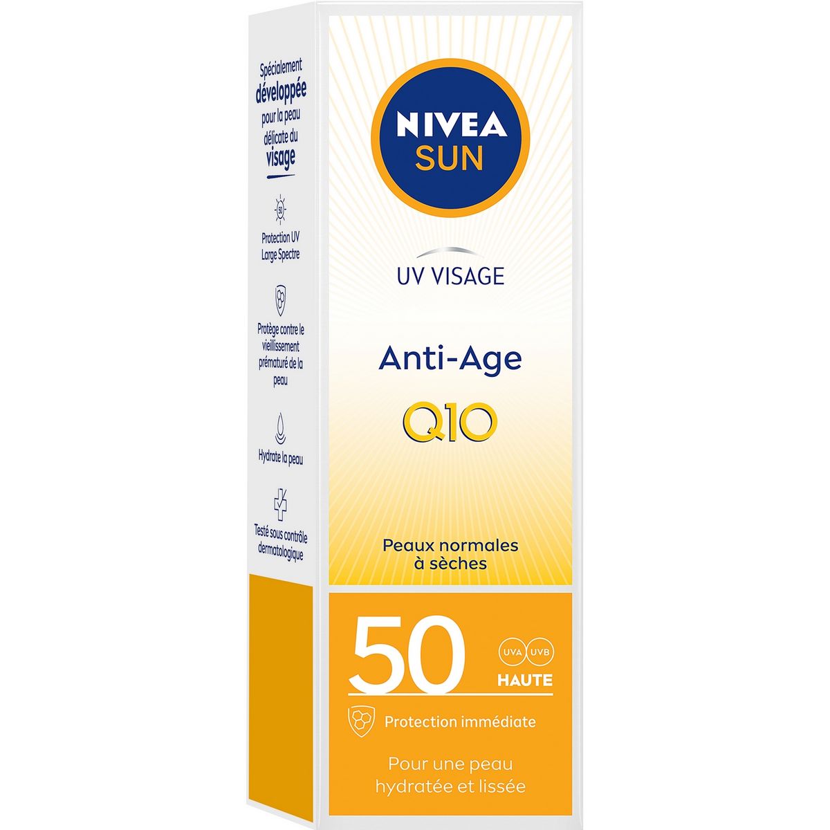La peau du visage est plus exposée au soleil que celle du corps et a besoin d’une protection solaire spécifique. La Crème Visage Anti-âge & Anti-Taches FPS 50 assure une protection UVA/UVB hautement efficace et immédiate contre les coups de soleil et le vieillissement cutané prématuré de la peau. Sa formule Soin au Q10 hydrate et prévient l’apparition des ridules, rides et des taches pigmentaires causées par le soleil. Sa texture ultra légère ne laisse pas de traces blanches sur la peau.