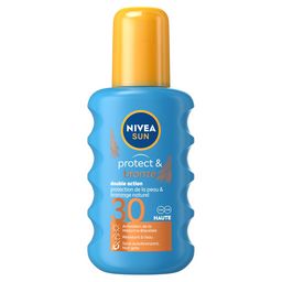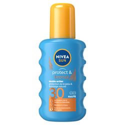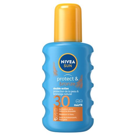 Le Spray Solaire Activateur de Bronzage FPS 30 NIVEA SUN offre une double action : une protection UVA/UVB immédiate pour votre peau et son vieillissement prématuré, ainsi qu'un bronzage naturel grâce à l'extrait de pro-mélanine breveté. La formule non grasse est résistante à l'eau et exempte d'autobronzant. Conseils d'utilisation : appliquez généreusement et de façon homogène sur votre corps avant l'exposition au soleil. Pensez à renouveler fréquemment l'utilisation particulièrement après avoir transpiré, vous être baigné ou essuyé. Bouteille recyclée à 95% (hors bouchon et pompe).