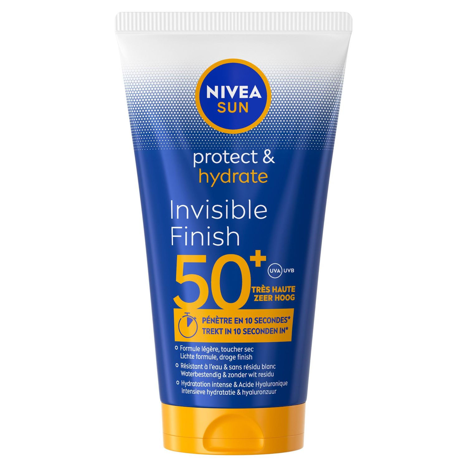 Protection UVA & UVB.Fini invisible & Absorption en 10 secondes Hydrate en profondeur grâce à l'Acide Hyaluronique Formule légère, non grasse, résistante à l'eau et sans résidu blanc.