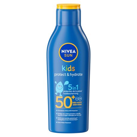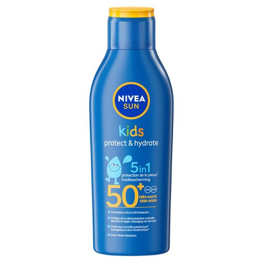 Le lait solaire Protect & Hydrate Kids FPS 50+ Nivea SUN est un lait solaire 5en1 qui protège efficacement la peau des enfants et aide à minimiser le risque de réactions allergiques dues au soleil. Grâce à une protection UVA/UVB hautement efficace, cet écran solaire protège des coups de soleil et des dommages cutanés liés au soleil. La formule, à l'huile d'amande biologique assure une hydratation intense et de longue durée à la peau sensible et fragile des enfants. Ce produit solaire est résistant à l'eau, pas besoin d'attendre avant de vous baigner!