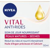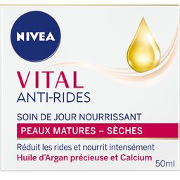 Utilisé régulièrement, ce Soin de Jour Nourrissant VITAL ANTI-RIDES de NIVEA® , à la formule enrichie en Huile d’Argan précieuse et en Calcium, combat les rides de l’intérieur et nourrit intensément les peaux matures pour un confort immédiat. La protection anti-UVA/UVB aide à prévenir l’apparition des rides causées par les agressions extérieures. Ce soin riche à la texture onctueuse nourrit et hydrate intensément les peaux sèches. Testé sous contrôle dermatologique. Cette formule aux propriétés nourrissantes contient un complexe d’ingrédients et de minéraux adaptés aux besoins des peaux matures : - Huile d’Argan : huile précieuse d’origine naturelle très appréciée pour ses vertus nourrissantes et antioxydantes. - Calcium : reconnu pour sa capacité à renforcer la structure cutanée.