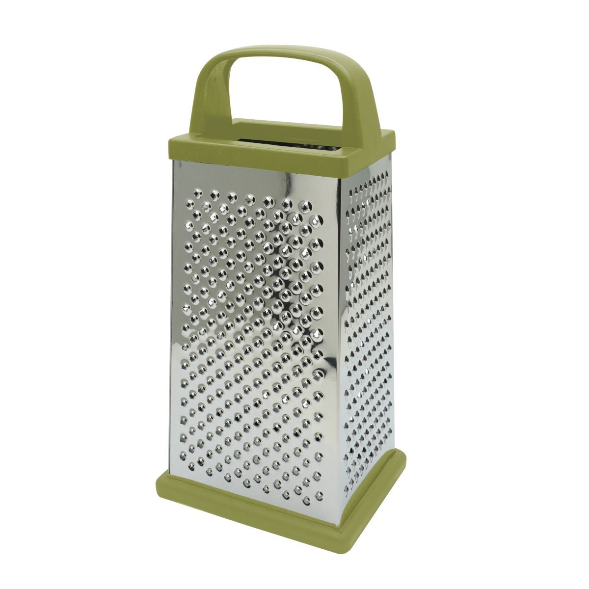Râpe 4 faces en inox verte. Grâce à ces 4 côtés, cette râpe en inox vous permettra de râper tous types d'aliments ! Des carottes, concombre, pomme de terre, ou encore le fromage !