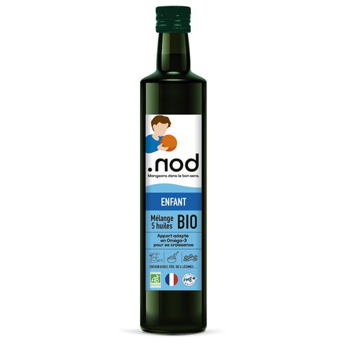 Un enfant a des besoins nutritionnels spécifiques qu'une alimentation adaptée doit satisfaire. Conçue par des nutritionnistes, l'huile ENFANTS .nod associe 5 huiles bio en proportions parfaitement adaptées aux besoins nutritionnels des enfants à partir de 3ans. Elle permet ainsi de couvrir l'ensemble de ses besoins en Omega 3, Vitamine E et surtout DHA, des nutriments indispensables à une bonne croissance.