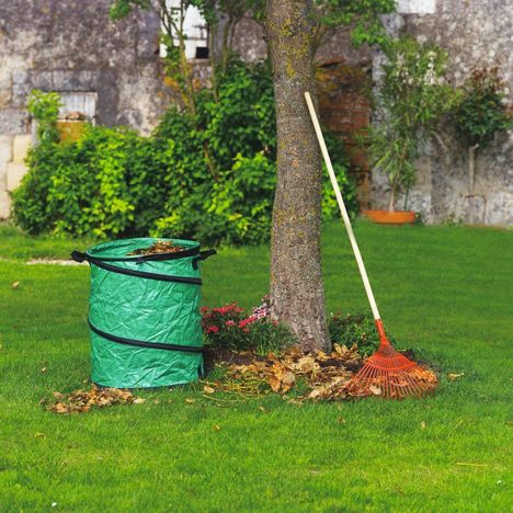 Sac dechets verts. Son arceau intégré fait ressort et ce sac pour déchets verts tient tout seul, il se replie pour rangement. Dimensions: Diamètre 49 cm x Hauteur 0,62 cm. Contenance: 116 litres