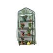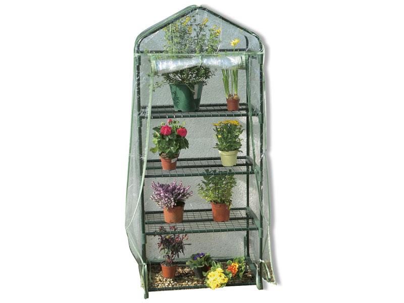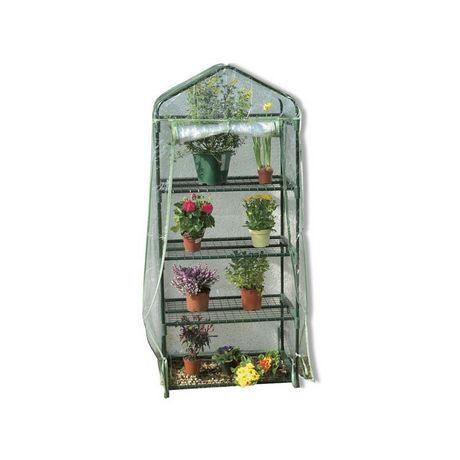 Mini serre pour balcon sur 4 étages, le Balcony 4, muni de sa couverture transparente en PVC vous permettra à la fois de ne pas perdre de place sur votre balcon ou terrasse mais aussi et surtout de couvrir vos semis et plantes durant l'hiver. 4 étagères amovibles. Couverture en PVC transparent avec porte équipée de zips. Dimensions : hauteur 1,58 m largeur 70 cm profondeur 50 cm.