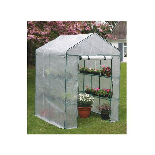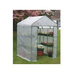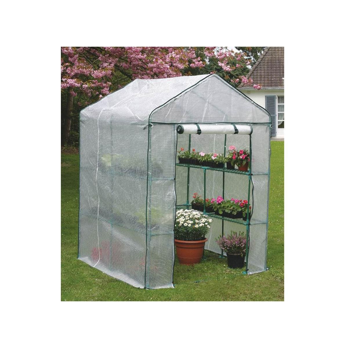 Serre de jardin pour semis et hivernage. Sa taille lui permet d'être intégré facilement même dans les plus petits jardins. Les 4 étagères permettent de placer les caisses à semis ou pots de fleurs. Structure en tubes acier peint époxy. Couverture en film armé. Dimensions largeur 1,43 m profondeur 1,