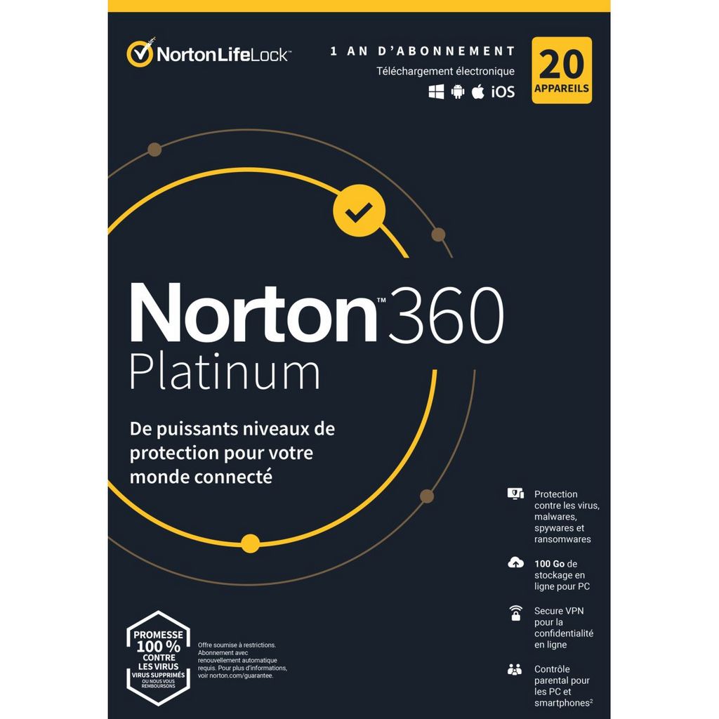 - Protégez jusqu'à 20 appareils, dont les PC, Mac®, smartphones et tablettes, contre les malwares, le phishing et les ransomwares (1)(2).- Accédez à vos apps et à vos sites web favoris en vous connectant à un réseau Wi-Fi, chez vous ou lors de vos déplacements, en bénéficiant d'un chiffrement avancé grâce à Secure VPN.
