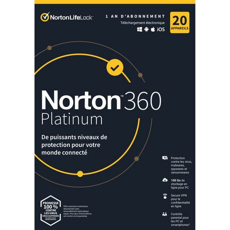 Norton™ 360 Platinum est conçu pour fournir plusieurs niveaux de protection à vos PC, vos Mac® ou vos appareils mobiles, et pour préserver votre confidentialité en ligne aussi bien chez vous que lors de vos déplacements, le tout dans une seule et même solution.