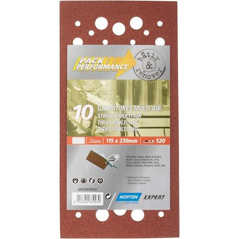 Type de produit : Papier abrasifMarque du produit : NORTONTaille de l'abrasif (en ... x ... mm) : 115x230Nombre d'unités consommateur : 10Perforé : OuiType de grain : 120Type de machine : Ponceuse vibranteType de fixation : Auto-agrippantEAN : 3157629339039Référence produit : 1095225