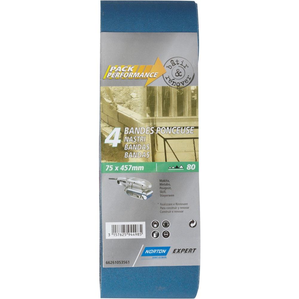 Lot de 4 bandes abrasives NORTON, 75 x 457 mm, grains 80