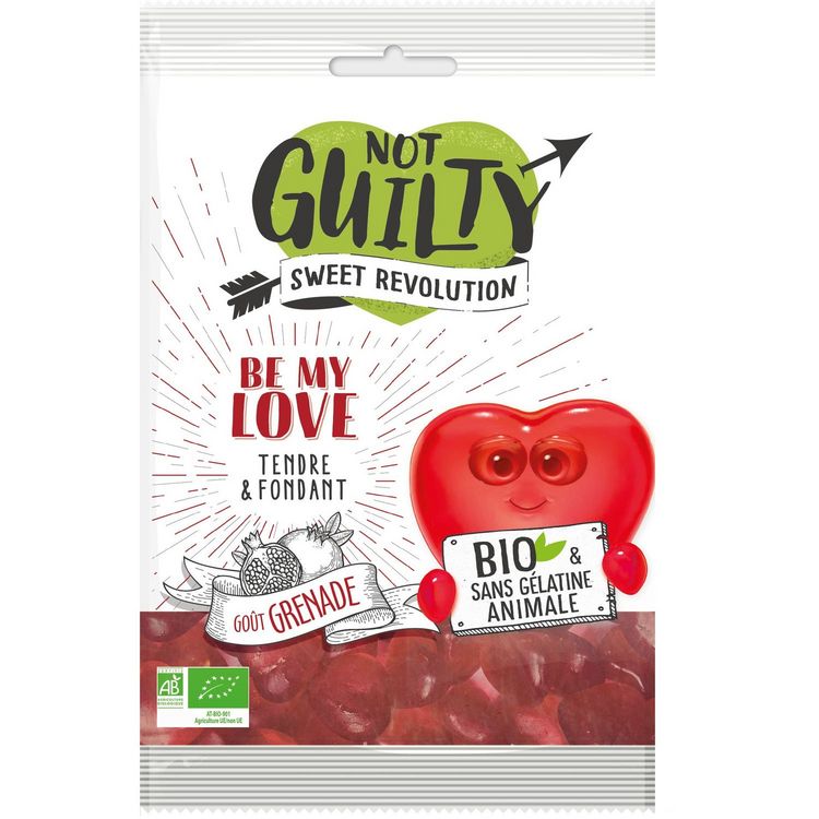 Découvrez Be My Love par Not Guilty, un tendre bonbon gélifié en forme de coeurs, bio, sans gélatine animale et sans gluten. Un parfum grenade dans un format 100g pour séduire petits et grands. Avec ses bonbons à la formulation innovante, Not Guilty crée la "Sweet Révolution" et réinvente la notion de gourmandise! Bonbons gélifiés BIO saveur grenade