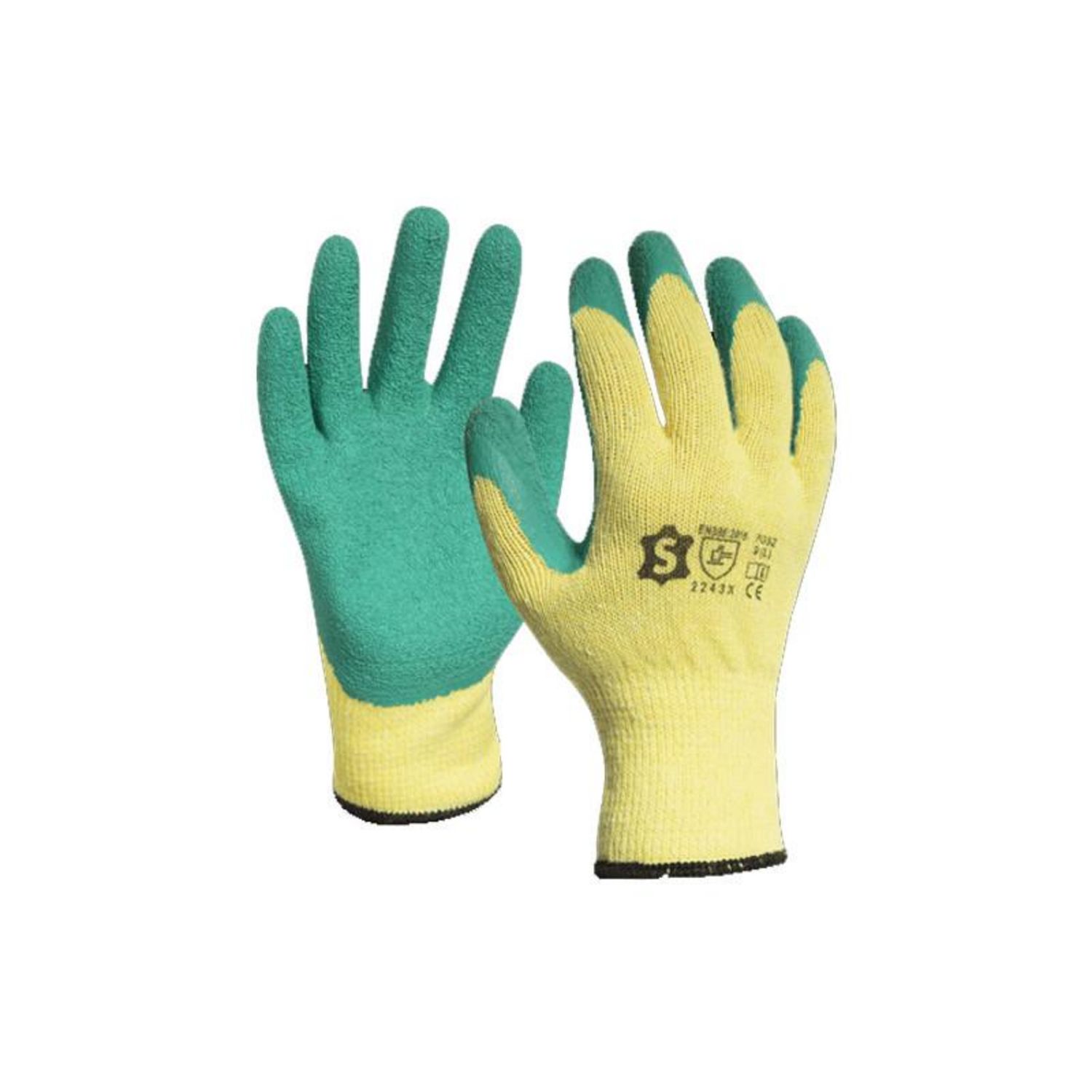 Sachet 12 paires de gants tricoté enduit en latex poignet bord cote jaune vert T10 7032E12