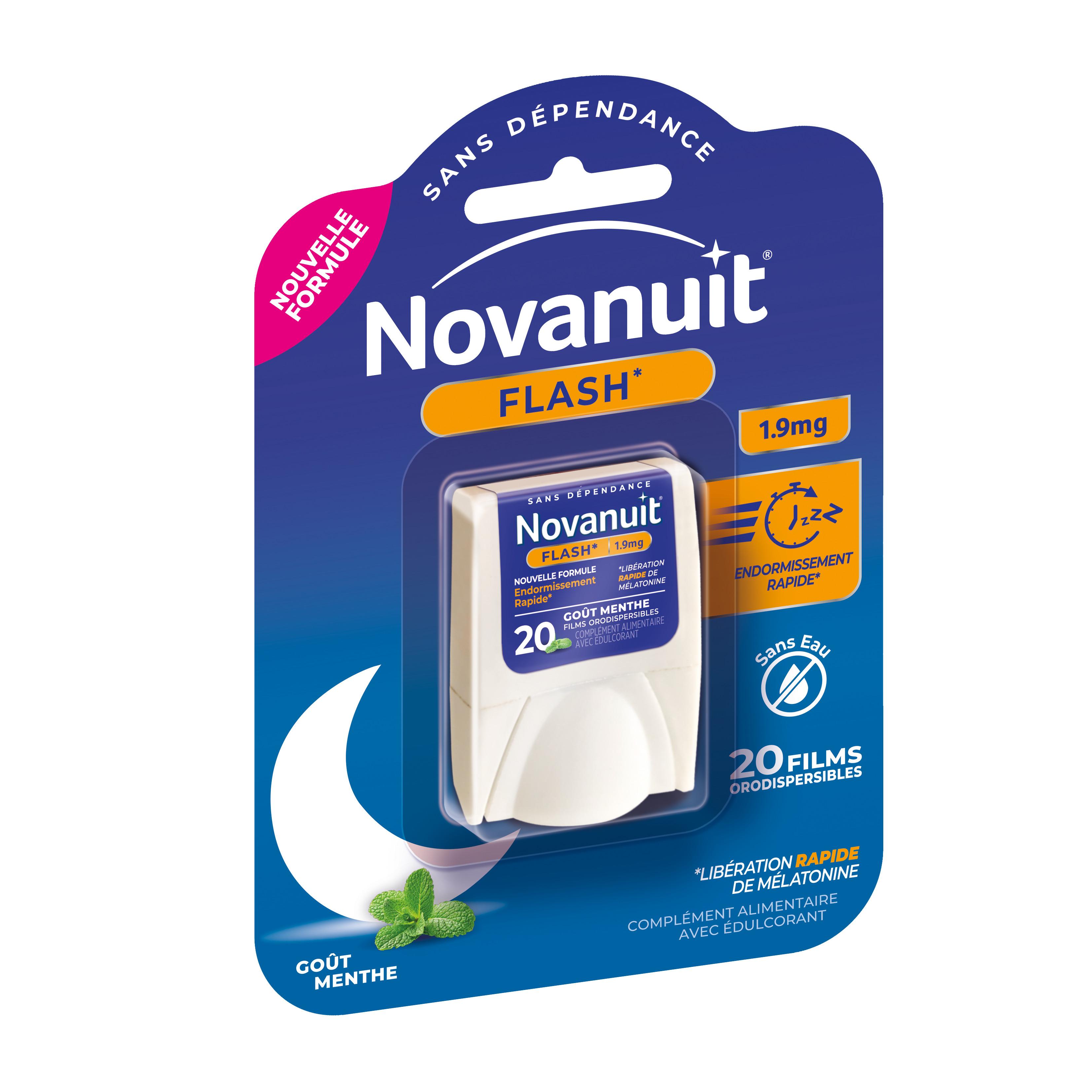NOVANUIT FLASH Complément alimentaire avec édulcorant réservé à l'adulte avec une libération rapide de mélatonine aide à l'endormissement et à réduire les effets ressentis du décalage horaire .